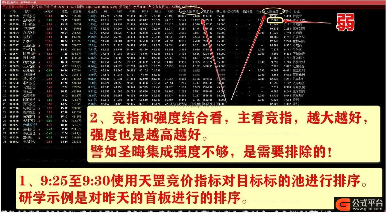 指标的原理就是通过竞价资金表现强中选强!对强势股票进行强弱排序。