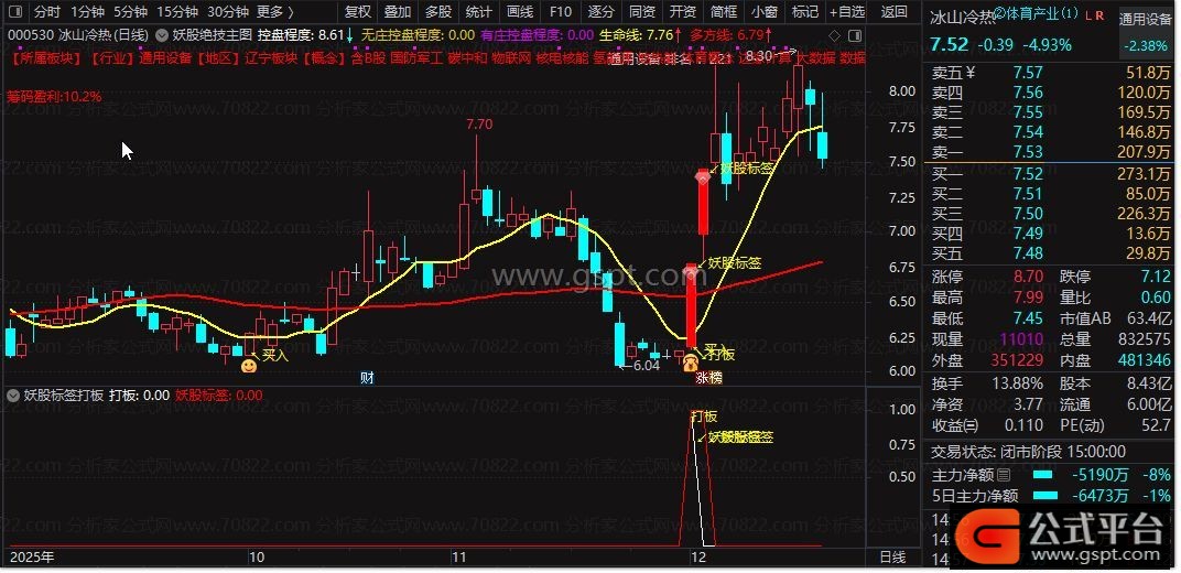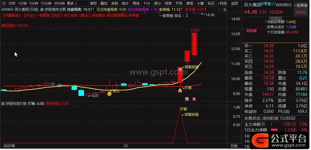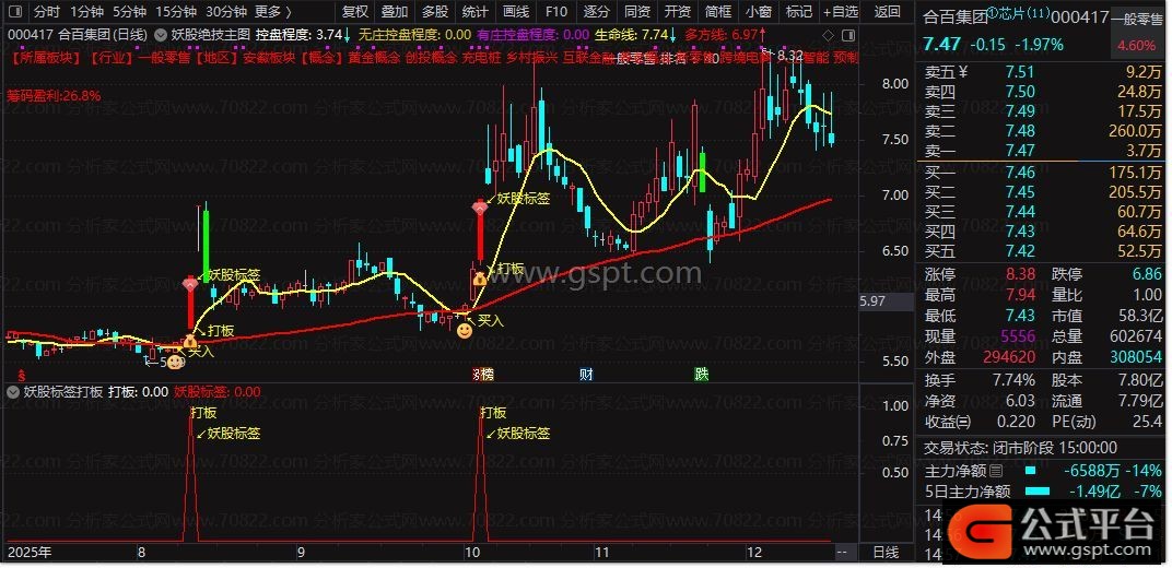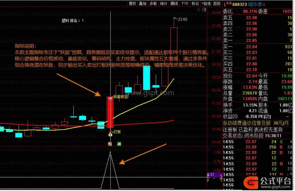 本款主图指标专注于"妖股"挖掘、趋势跟踪及买卖信号提示,适配通达信软件个股行情界面。核心逻辑整合价格波动、量能变化、筹码结构、主力控盘、板块属性五大维度,通过多条件组合筛选潜在妖股,同步输出买入卖出打板妖股标签等明确信号,辅助短线交易决策优化。