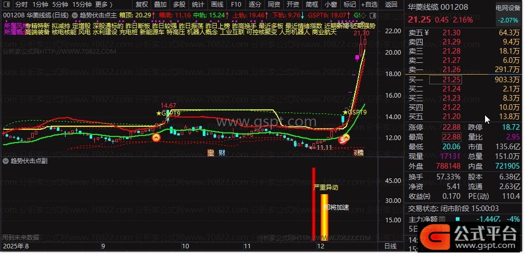 DRAWTEXT(FILTER(gspt81,15)=1,40,'严重异动')*gspt88,COLORYELLOW;