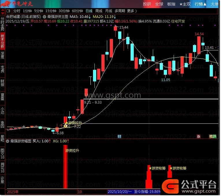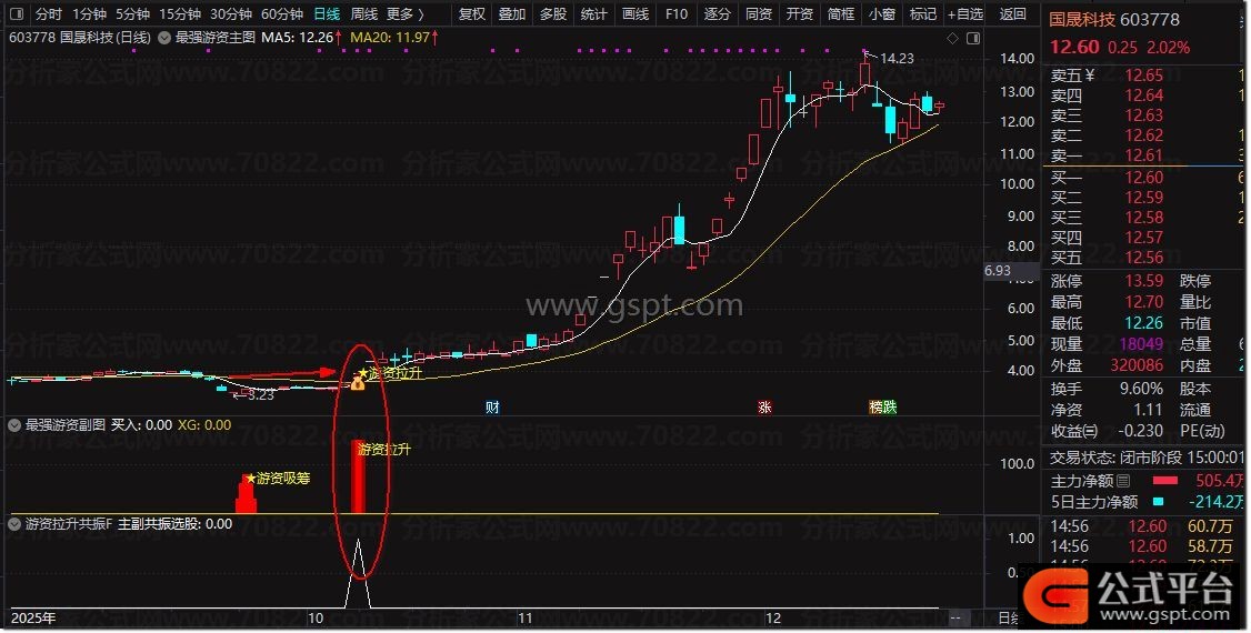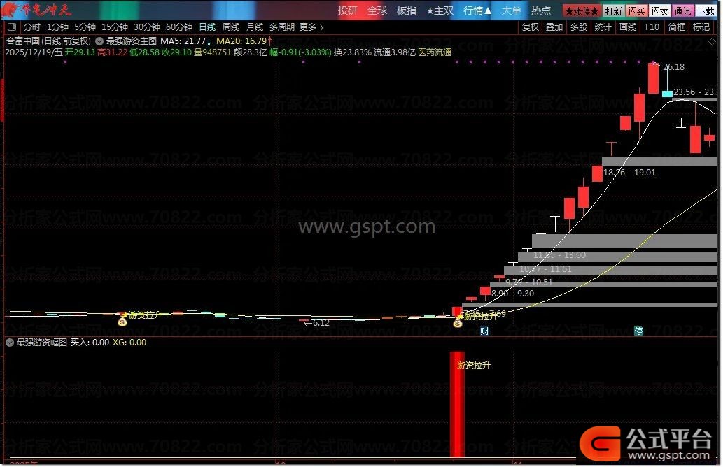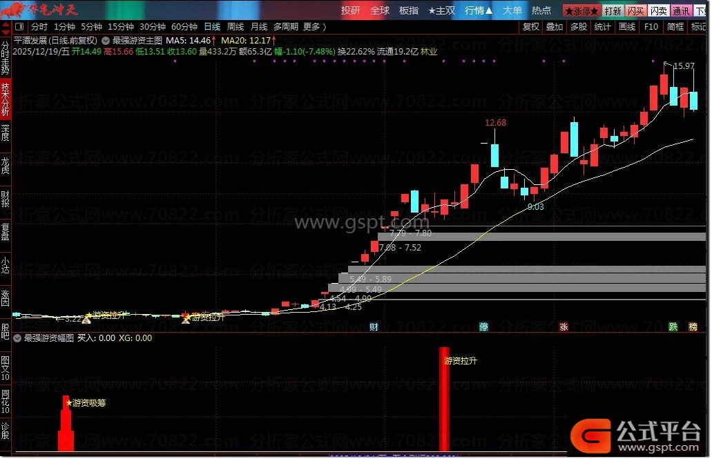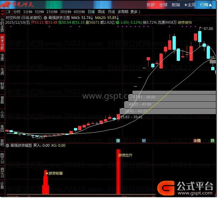 1. 信号确认:主图出现“游资拉升”信号时,结合副图同步出现的蓝色游资拉升柱体,确认短期强势趋势;