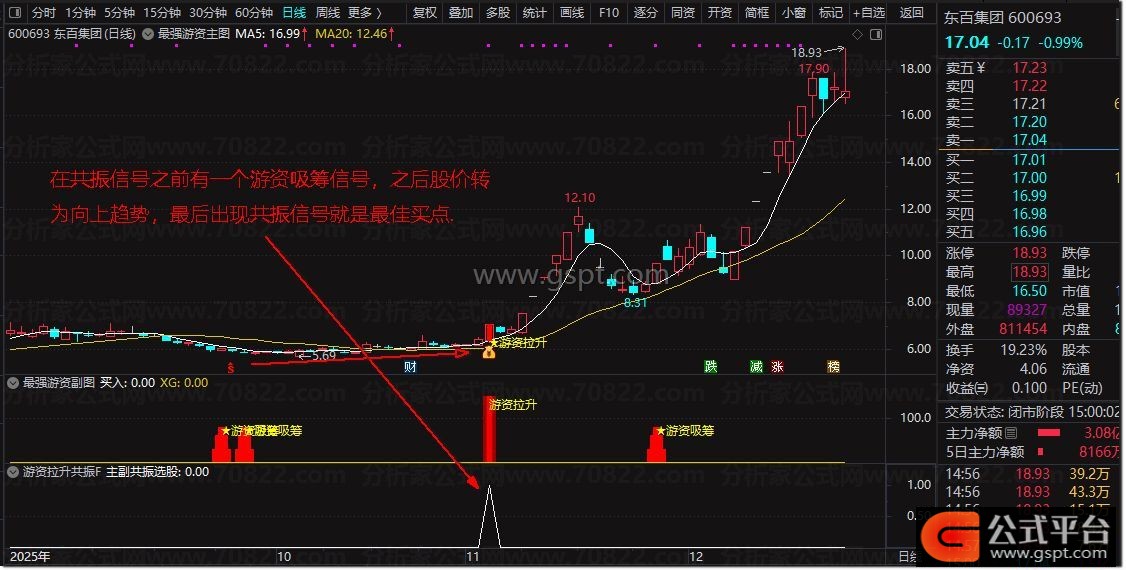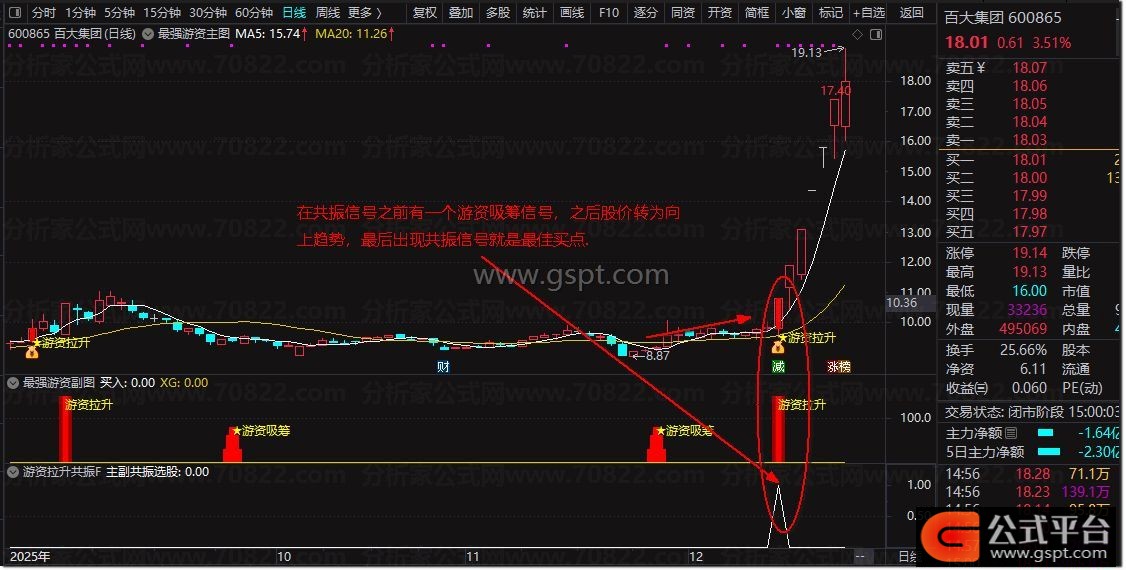 提示:在共振信号之前有一个游资吸筹信号,之后股价转为向上趋势,最后出现共振信号就是最佳买点。