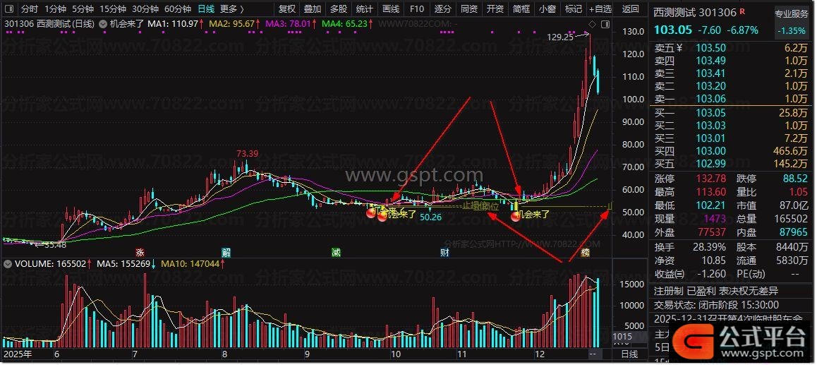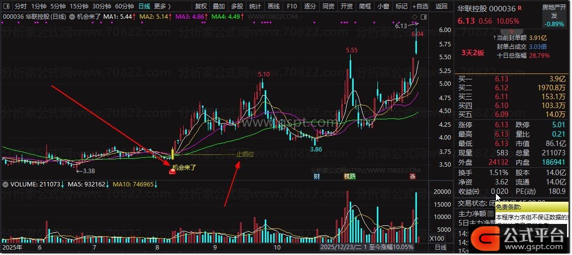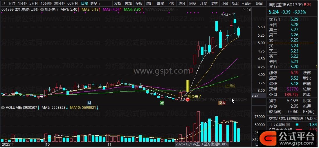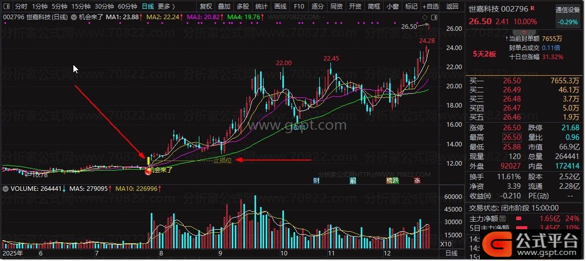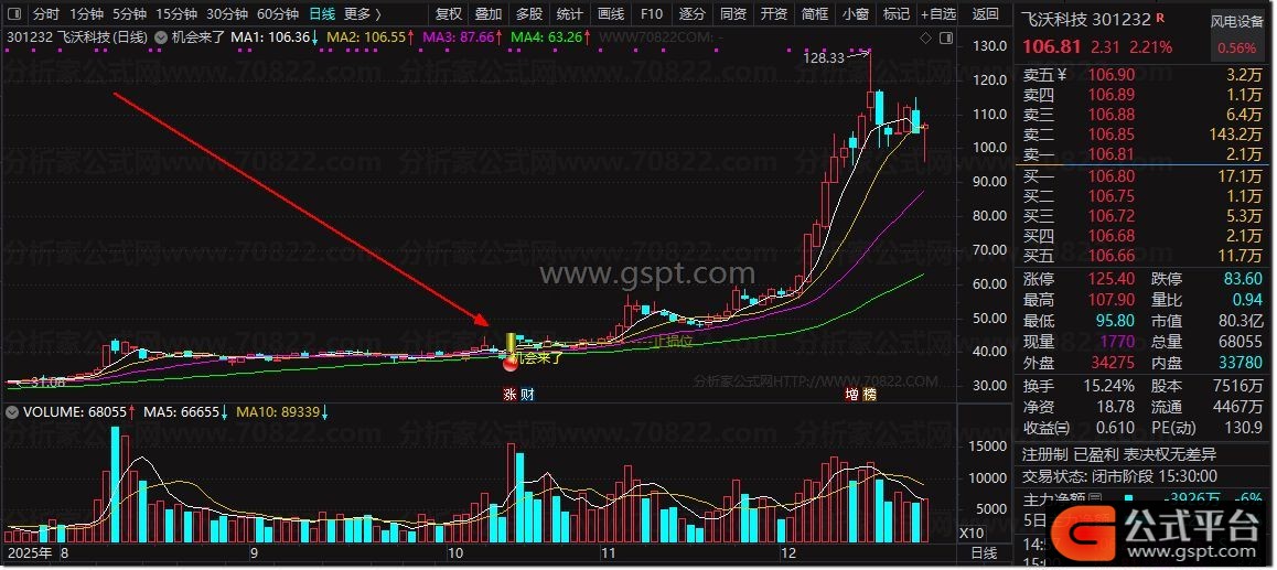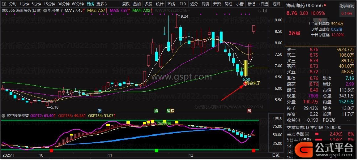 2. 信号识别:K线出现彩色分层柱体+黄色“机会来了”文字+红色图标,即为买点信号;