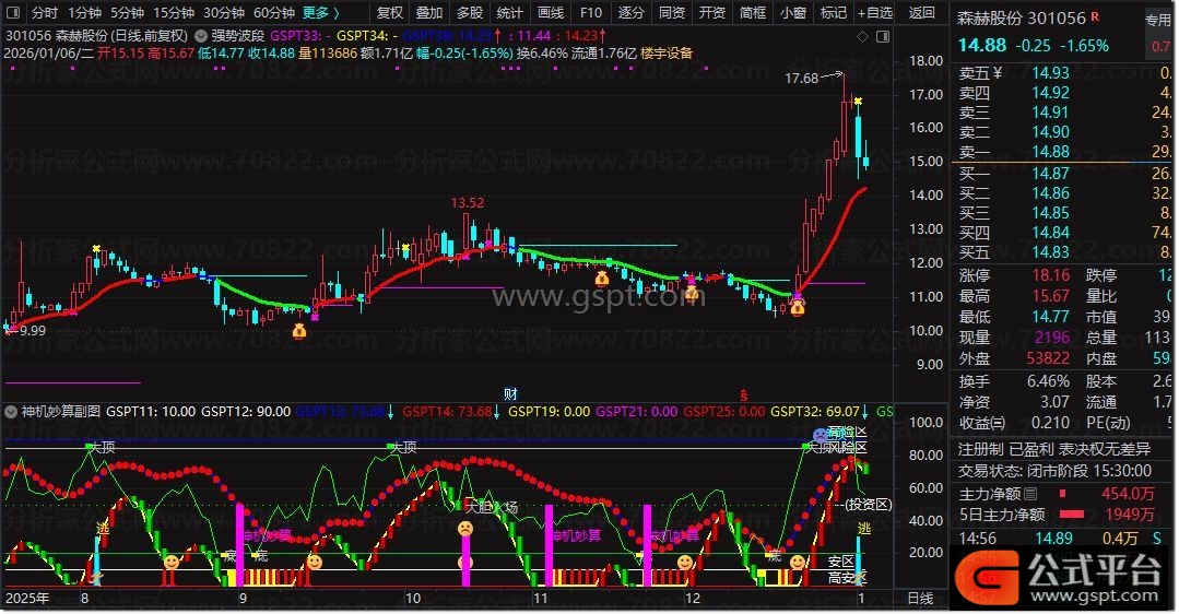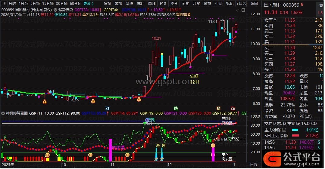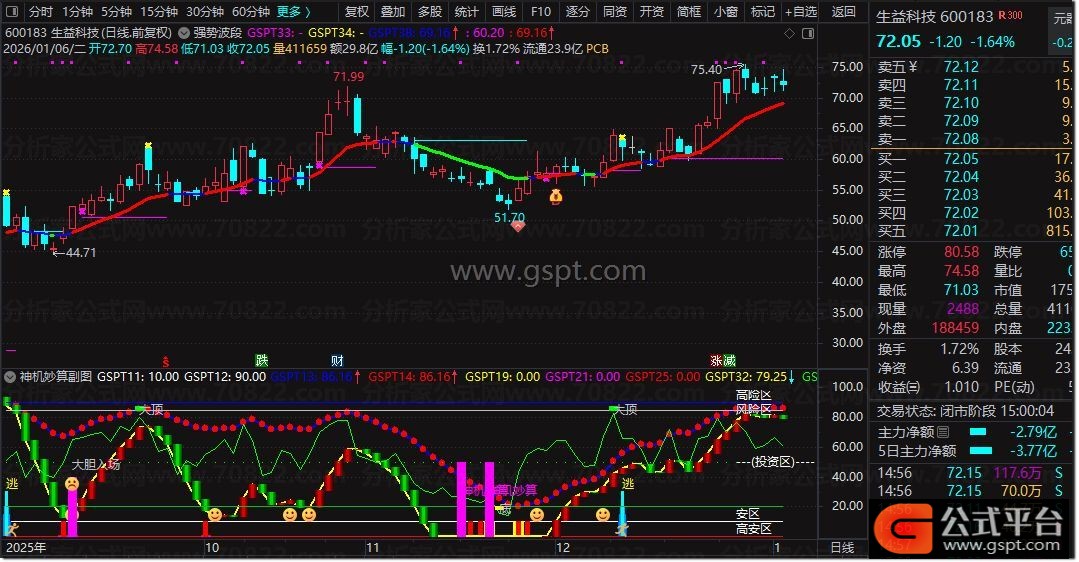 神机妙算指标是一款多维度综合型通达信副图指标,融合RSI、均线、乖离率、EMA等经典算法,通过价格波动、高低点区间、趋势动能等维度构建分析体系。核心逻辑是量化股价超买超卖区间,划分高险、风险、投资、安全、高安五大区域,并通过彩色柱线、文字标注、图标信号直观呈现买卖点,既适配短线波段操作,也可辅助中线趋势判断。