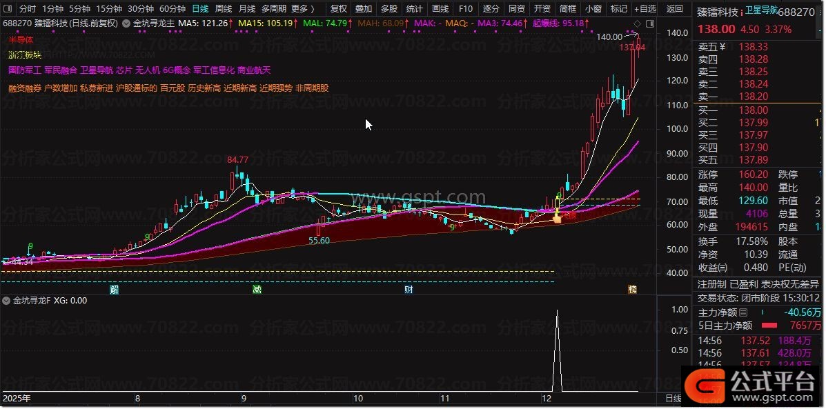 3、主图形态提示主升浪:主图中出现中阳线同时突破启爆线与红色彩带,且红色彩带处于粘合状态,是主升浪来临的强烈信号。此时股价突破阻力,强势确认,上涨概率大增。