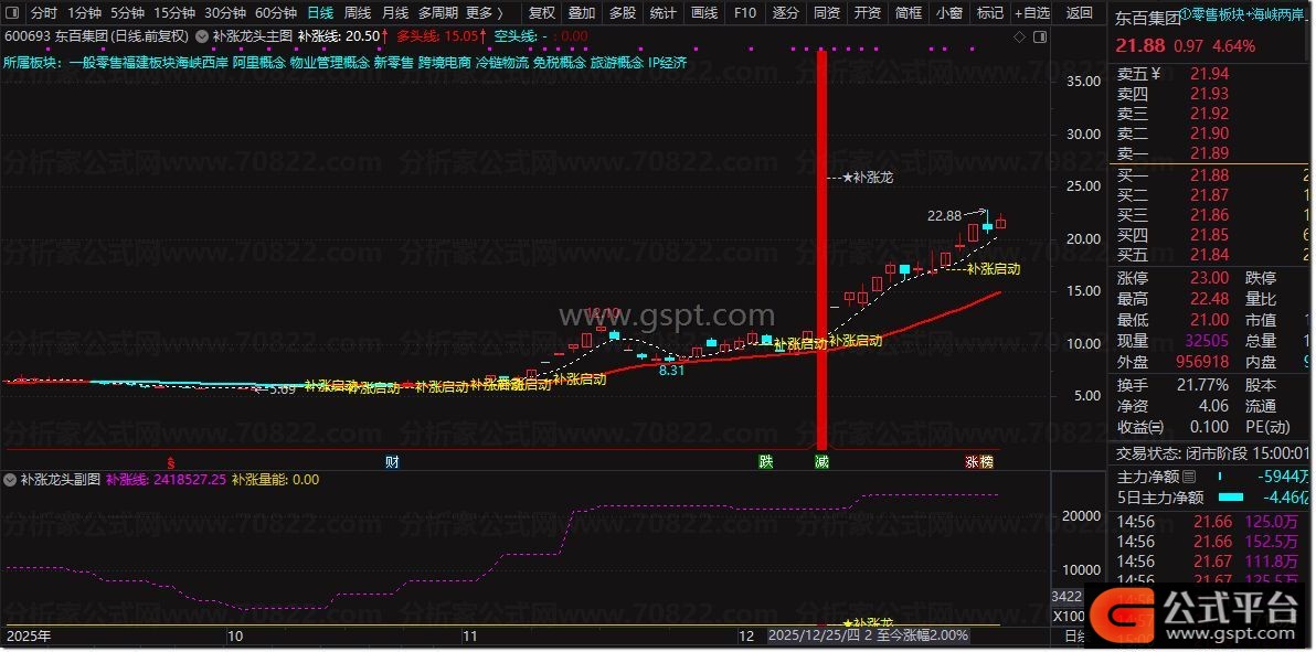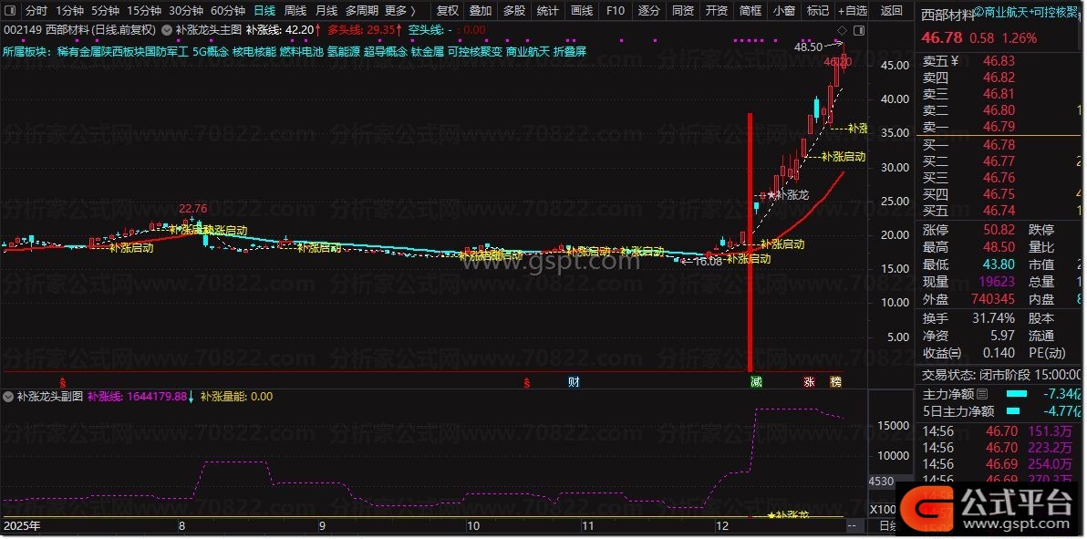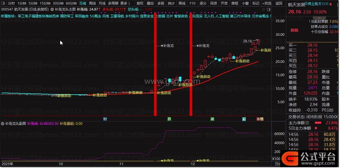 2. 副图:出现红色柱体+“补涨龙”标识,确认补涨强势;