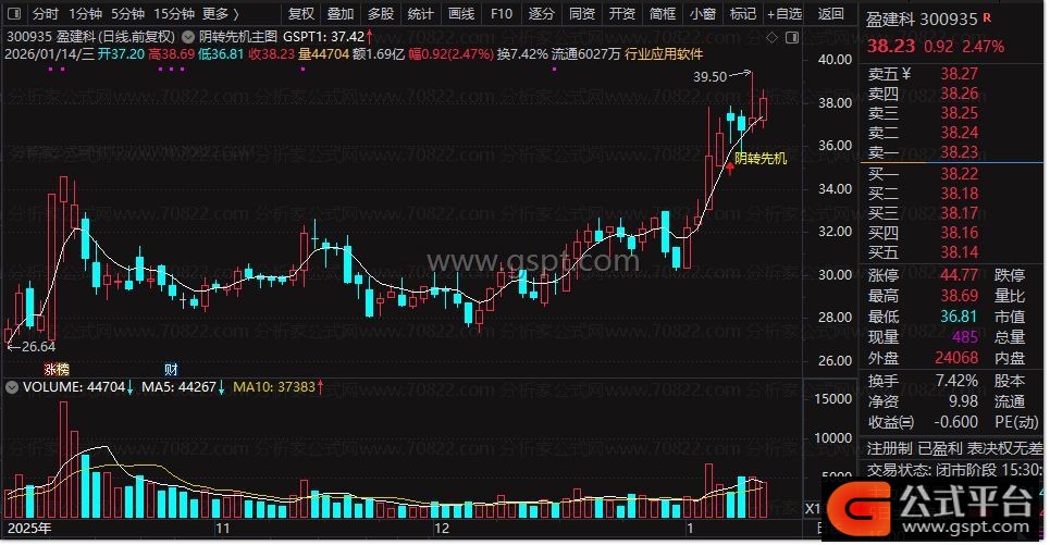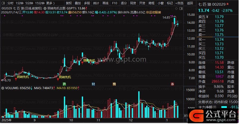 当条件满足时,主图在K线下方标注“阴转先机”文字及图标,直观提示机会区域。