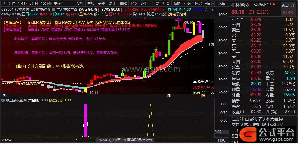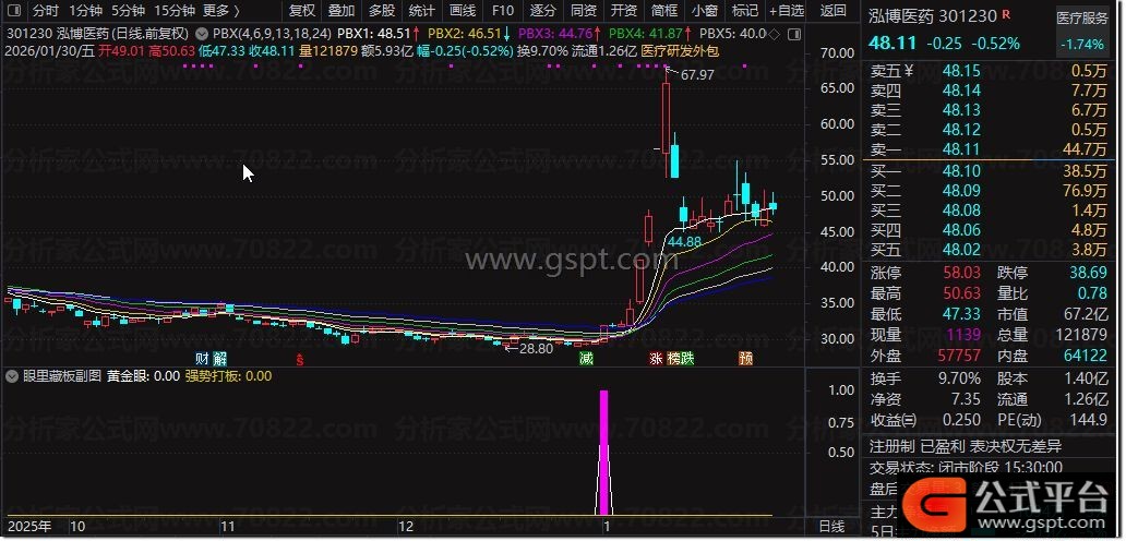 副图中,黄金眼信号聚焦5/30日均线乖离率修复、股价突破+均线拐头的低吸打板机会;强势打板信号结合MACD金叉、涨停、倍量、多头均线,捕捉强势连板机会。