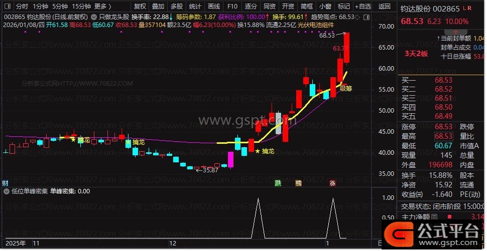 黄金线:IF(量化>=MA5 AND 量化>REF(量化,1),量化,DRAWNULL),LINETHICK3,COLORYELLOW;