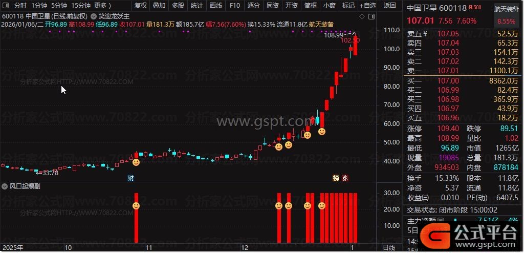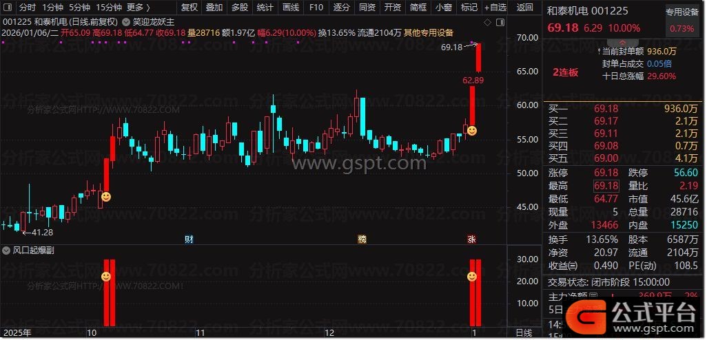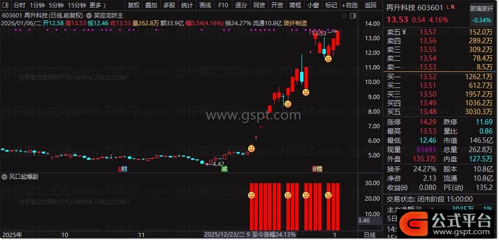 副图指标“风口起爆”:在副图区域同步显示降龙指标和信号。通过图标和色带标注超买与启动点,辅助确认主图信号,增强判断准确性。