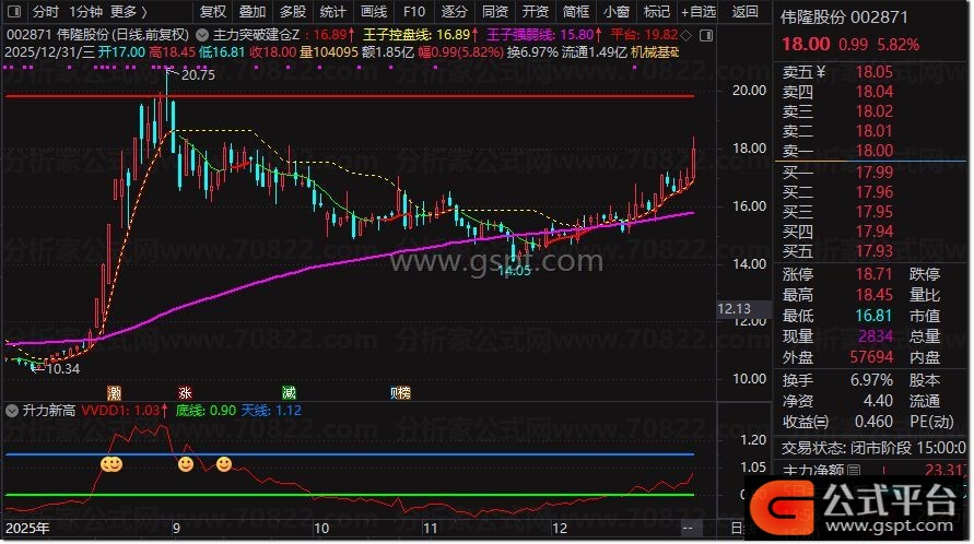 「升力新高」是一个基于个股相对大盘强度的趋势跟踪指标。它通过计算个股收盘价与大盘指数的比值,并与其长期均值比较,构建出“升力”线(VVDD1),用于衡量个股超越市场的内在动力。指标设有两条关键水平线:绿色底线(0.9) 为弱势支撑位,橙色天线(1.12) 为强势加速临界点。当升力线上穿底线时,预示个股可能启动;突破天线时,则往往进入加速上涨阶段。
