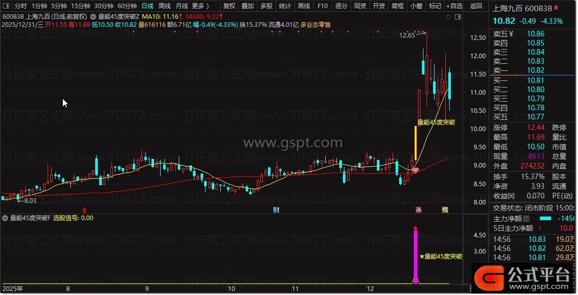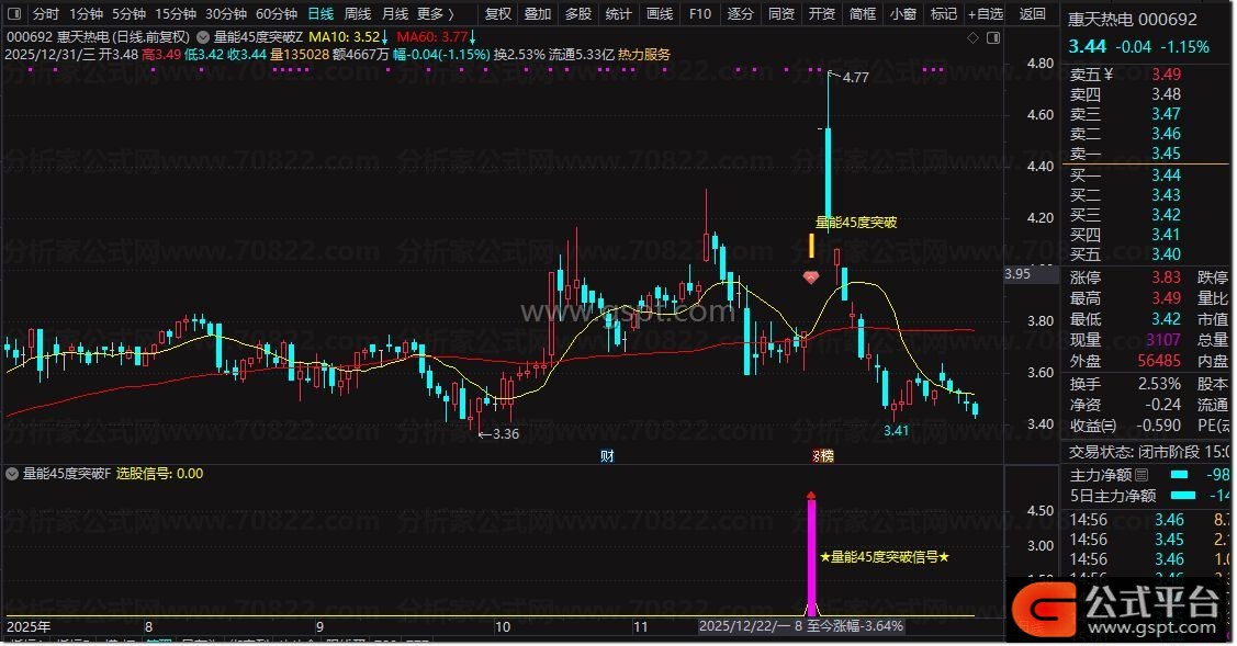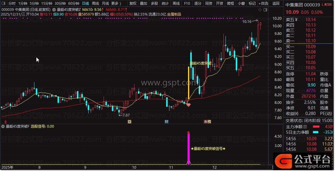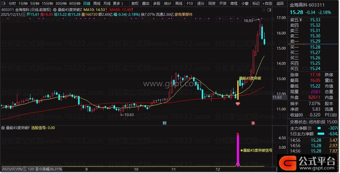 量能45度突破指标是一款短期趋势加速型共振指标,其核心逻辑是通过价格趋势陡峭度、资金动能金叉、量能支撑放量、均线结构多头排列突破五大维度同步验证,筛选星价势共振且短期上涨确定性高的个股。该指标适用于日线级别波段操作,帮助捕捉趋势加速初期的优质介入机会。
