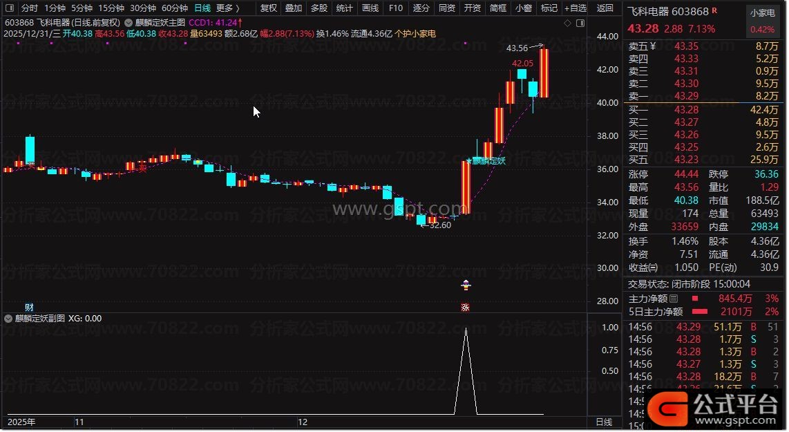 DRAWTEXT(CROSS(A1X,0) AND C>=REF(HHV(H,7),1) AND C>REF(C,1)*1.097 AND C=H AND CROSS(快,慢) AND C>=快 AND C>O,H*1,'★麒麟定妖'),COLORCYAN;