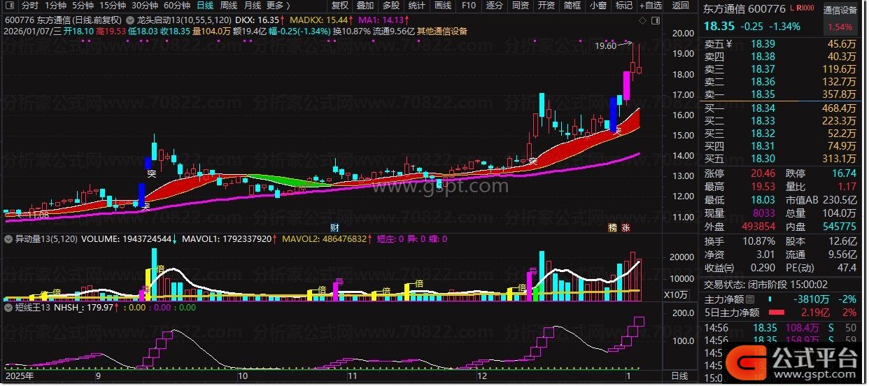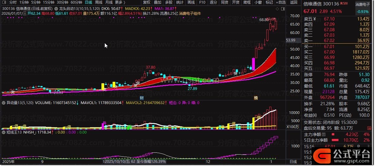 龙头启动公式组包含主图(龙头启动13)、副图(异动量13+短线王13)三套指标,专为短线捕捉龙头股启动信号设计。主图以DKX趋势指标为核心,结合价格、成交量、乖离率等维度,用不同颜色K线标注涨停、突破等关键信号,“突”字提示短线启动点;异动量13副图聚焦成交额异动,直观显示一倍量、异常放量、缩量等资金行为;短线王13副图融合均线、KDJ、换手等因子,精准识别资金进场的短线机会。