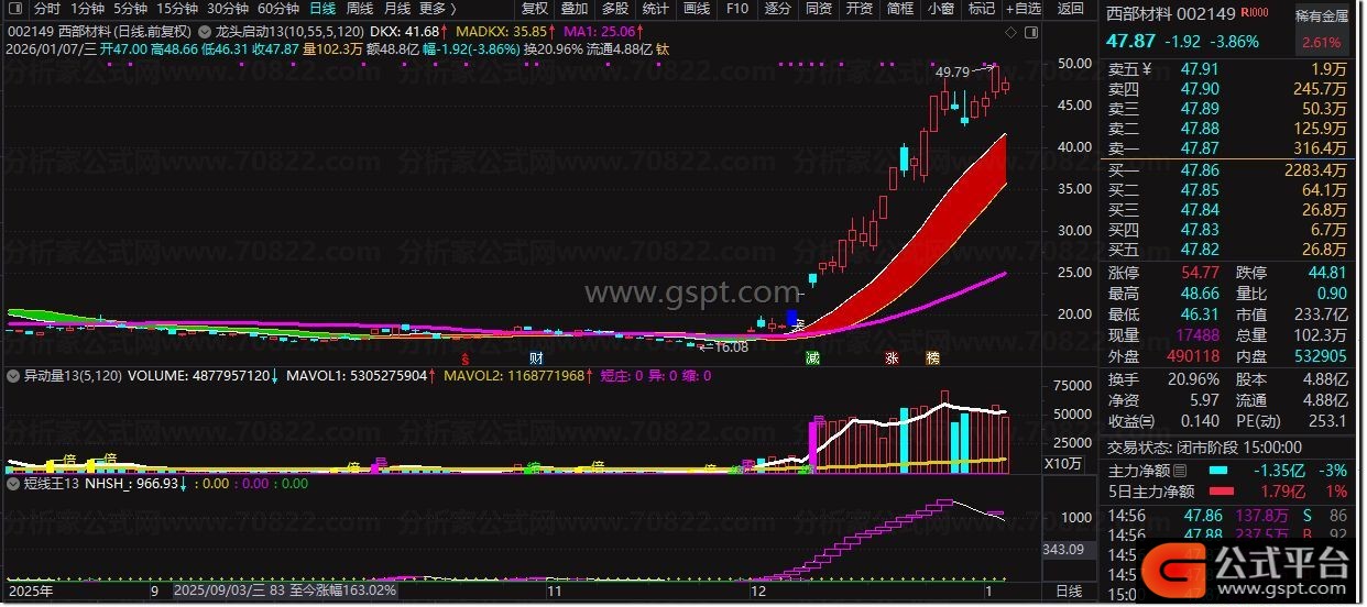 3. 短线王13副图指标数值上冲且出现红柱,叠加主图黄色/蓝色K线(涨停+高量),可重点关注;