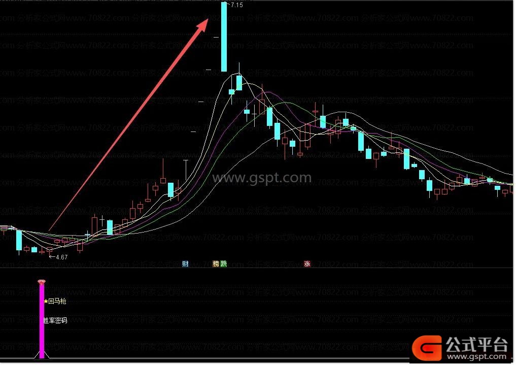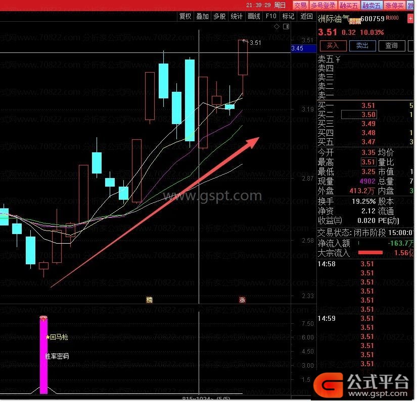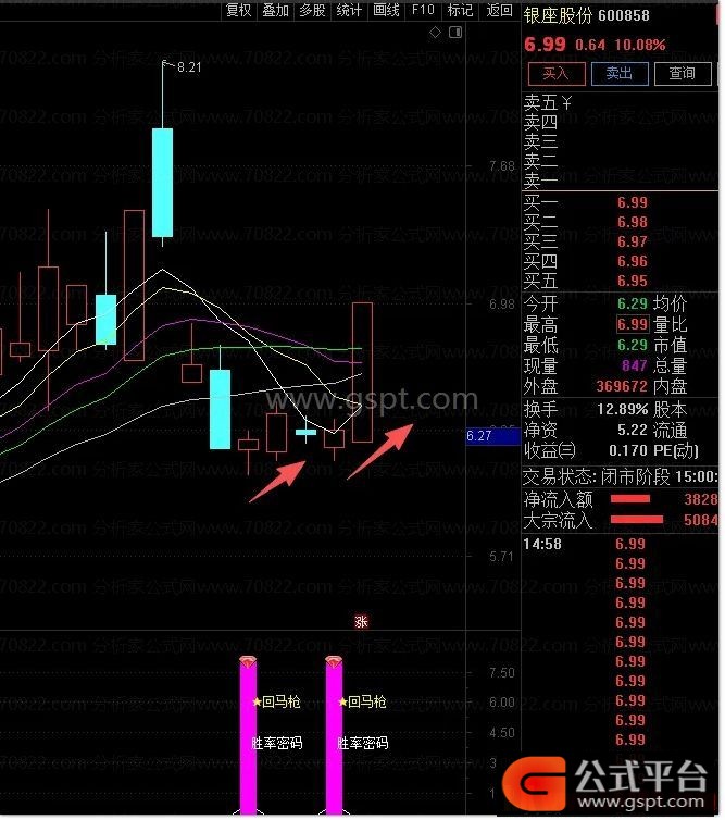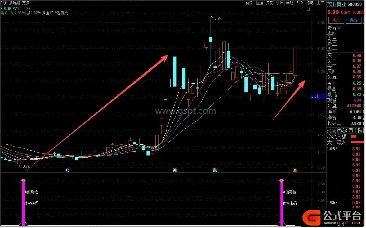 看信号:副图出现紫色柱子与回马字样。
