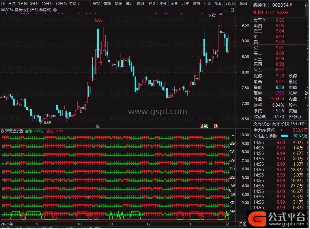 全绿:IF((gspt33 AND gspt30< 0),1,0),COLORGREEN,LINETHICK2;