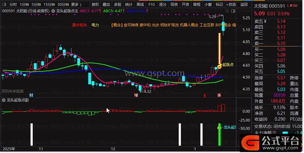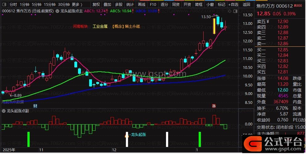 1. 加载后,K线区自动显示【★起涨点】黄色文字+图标,出现该信号=个股符合龙头起涨条件,可重点关注;