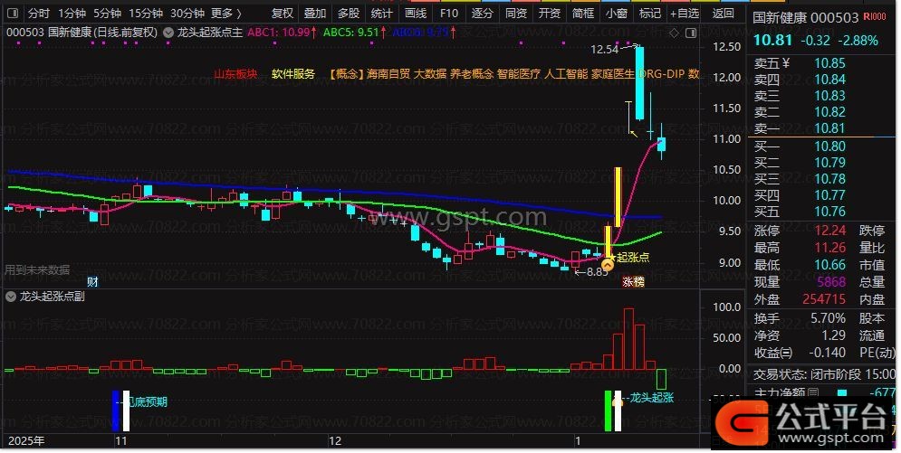 主图叠加个股所属**地域、行业、概念板块**,直观掌握题材属性;副图明确提示见底预期、龙头起涨、游资进场等关键信号;选股公式一键筛选符合条件的龙头标的,三者联动胜率更高。