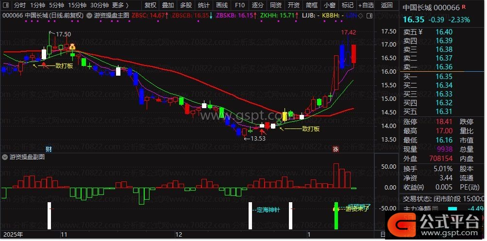 3. 结合主图的“打板”信号与副图的“游资来了”、“超预期”等共振信号,并在主图出现白色/黄色买点K线时,可重点关注短期操作机会。
