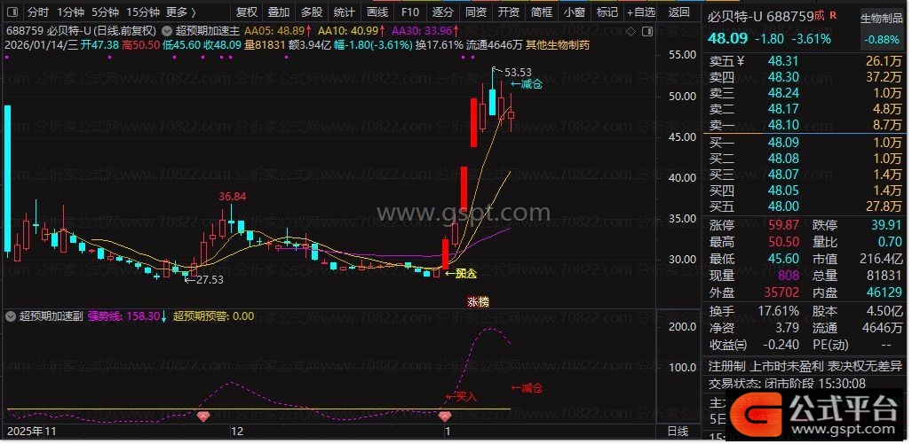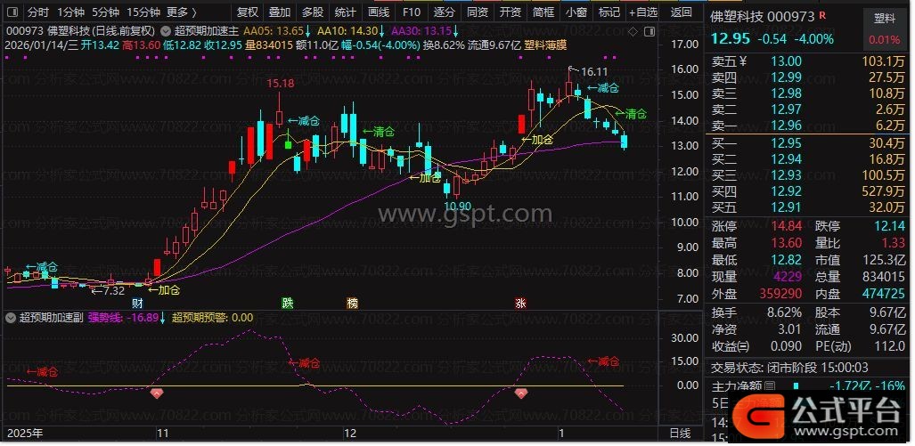 主图:叠加均线+标注买入/加仓/减仓/清仓/超预期信号,附带仓位建议+涨跌停变色K线;