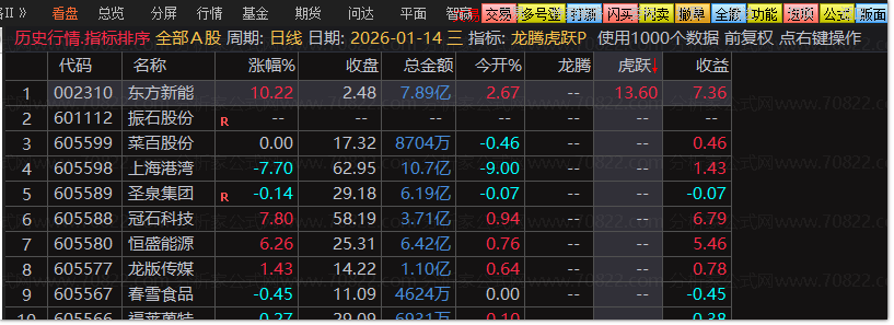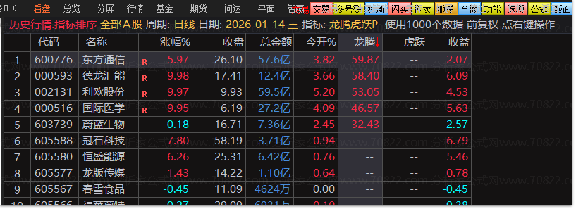 交易日9:25竞价结束后至9:30开盘前,打开通达信软件,按快捷键.401进入排序界面,将排序指标切换为【龙腾虎跃P】公式;其中龙腾排序数值按由高到低排列,重点把握一进二机会及接力板个股;虎跃排序数值按由高到低排列,重点捕捉首板个股机会;