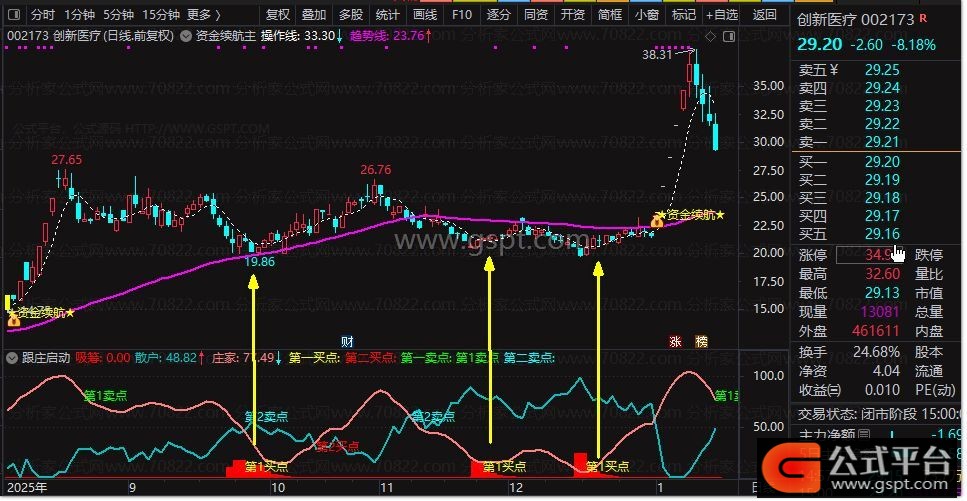 同时设有两个卖点提示,辅助高抛止盈。适用于震荡市或底部反转行情,建议配合成交量验证使用。在通达信软件中直接导入即可,信号清晰直观,助你先人一步“搭上庄股快车”!