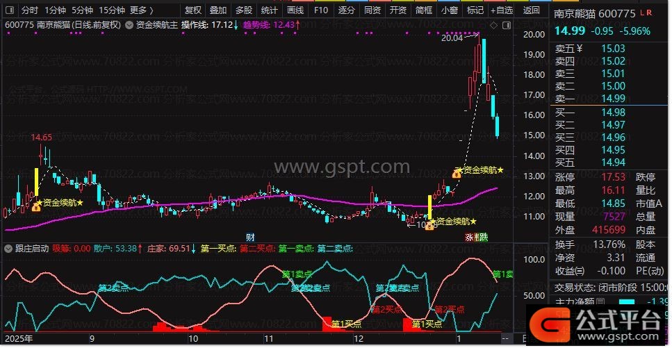 - 第一买点:当主力吸筹力度从低位快速回升,突破14阈值时,预示建仓初期;