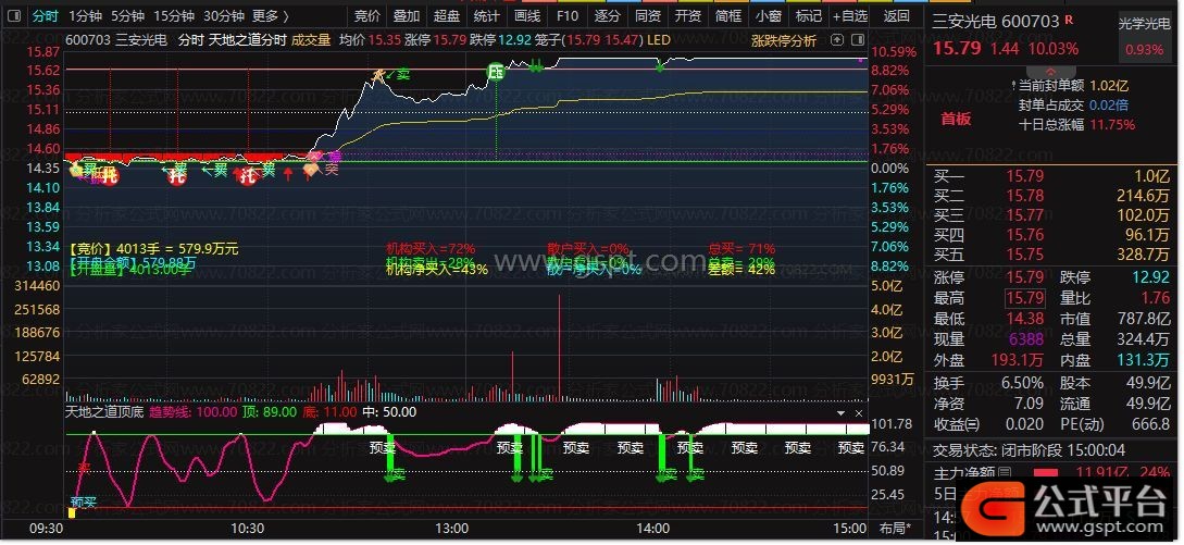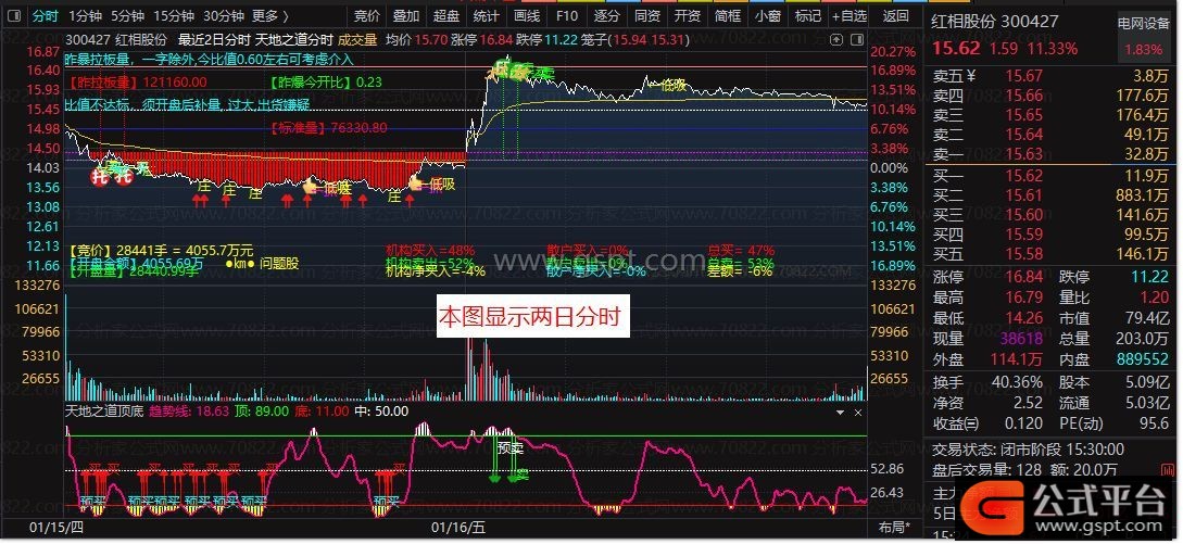今天给大家分享两款实用的通达信分时指标,分别是天地之道分时主图和天地之道顶底副图。