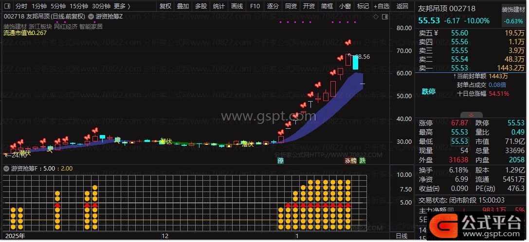 配套副图游资抢筹F指标通过价格波动率叠加多重均线通道突破评分机制,以0至10分位图标直观展示资金抢筹强度。当个股涨幅达标且评分较高时,副图将密集显示抢筹图标,提示游资活跃,与主图信号形成强共振。
