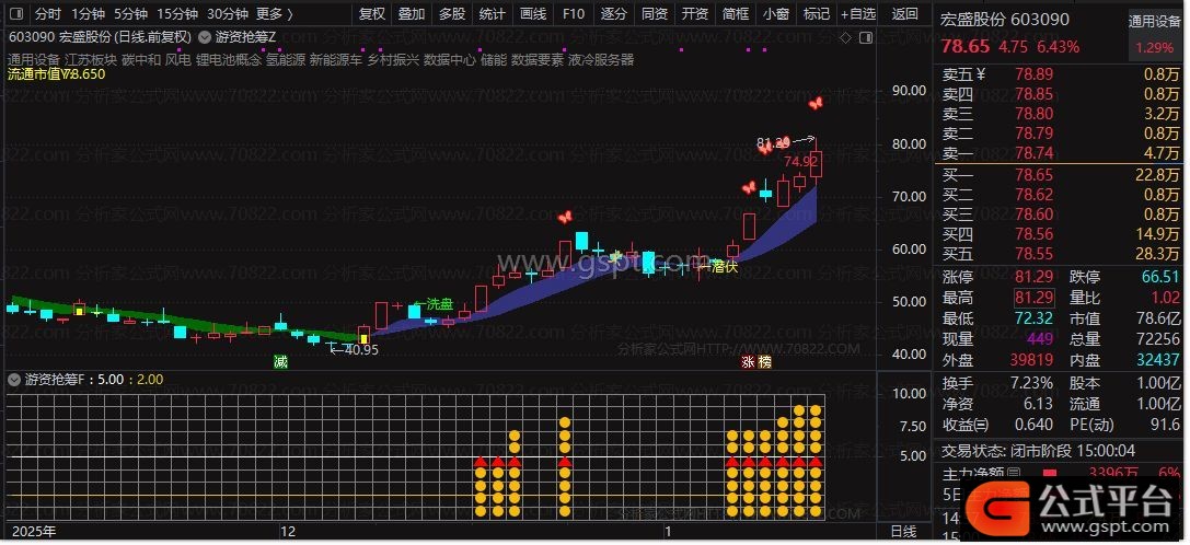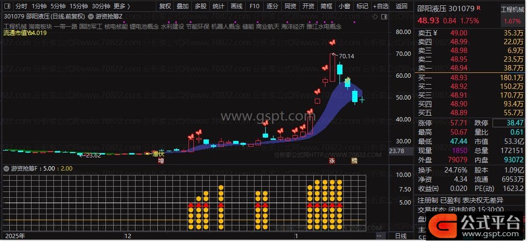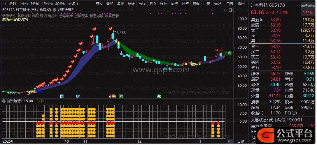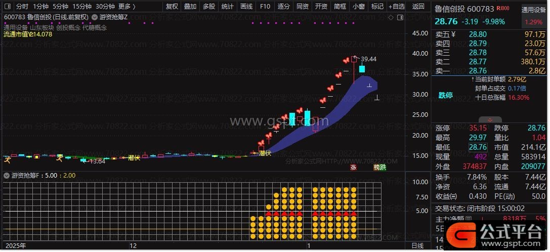 游资抢筹Z主图指标融合多周期EMA均线、主力控盘模型与连板识别逻辑,精准标注起爆点、洗盘阶段、潜伏区域等关键交易信号,并结合流通市值与行业板块信息辅助选股决策。该主图指标特别适合捕捉强势首板及连板启动初期的短线介入机会。