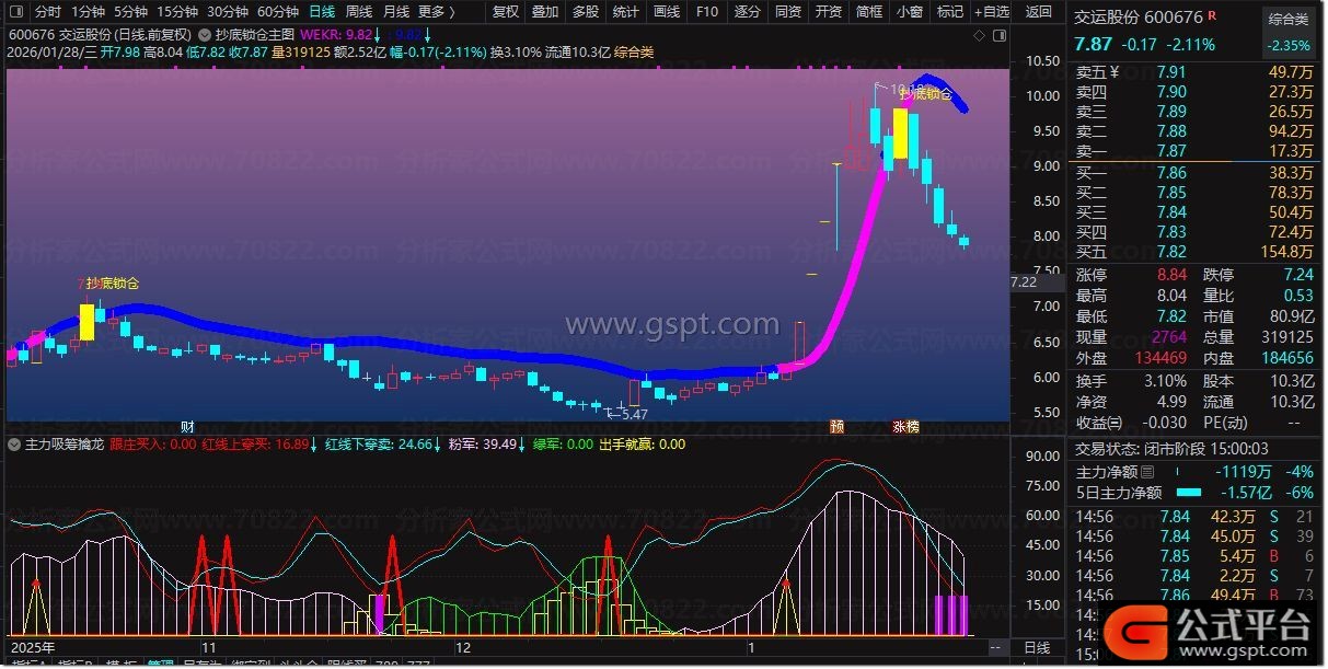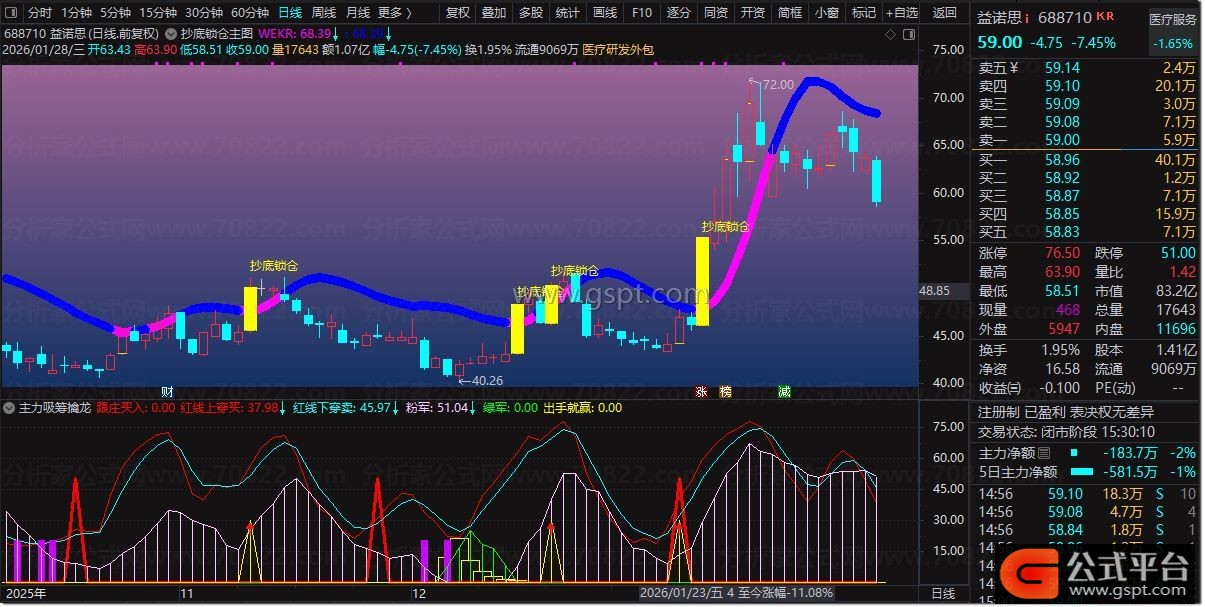 “该指标通过量化‘创新低过程中的异常能量积蓄’(gsptH)与‘传统动量的爆发性转折’(如KDJ加速度)之间的共振,来捕捉主力底部吸筹后引发的短线强势反弹。”