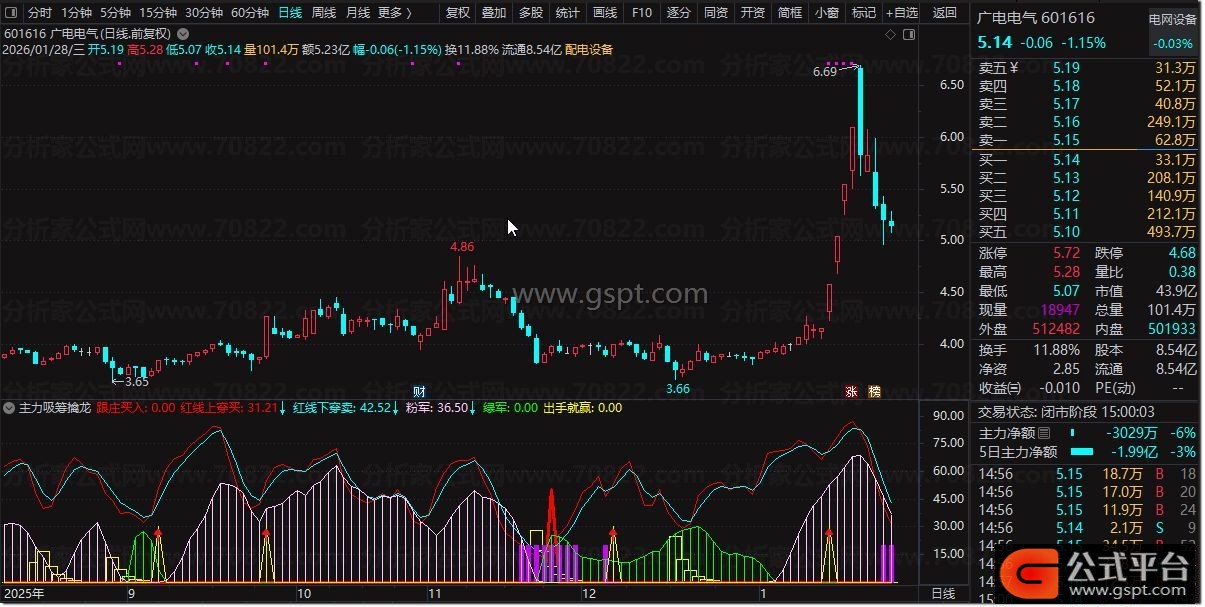 1. 吸筹(浅蓝柱):柱体越高,主力低位吸筹力度越强,柱体持续放大为资金进场信号;