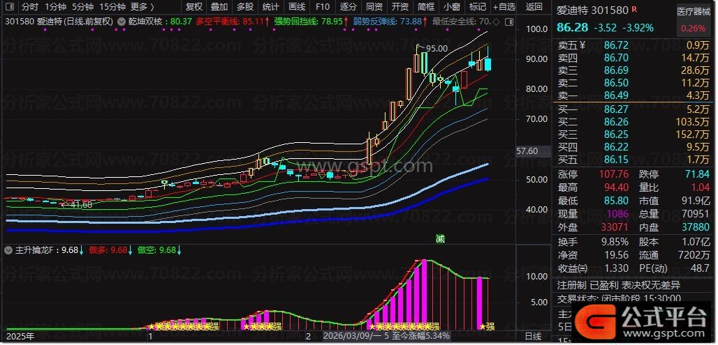 3. 风控分层:绿色强势回挡线、灰色最低安全线为低吸参考,白色获利了结线、蓝色超涨出货线为止盈参考;