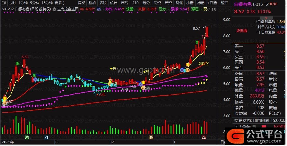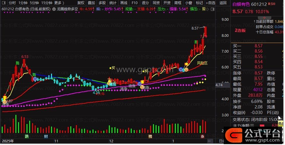 DRAWTEXT(涨>180 AND REF(涨,1)< 180,L * 0.92,'高危区'),COLORWHITE;