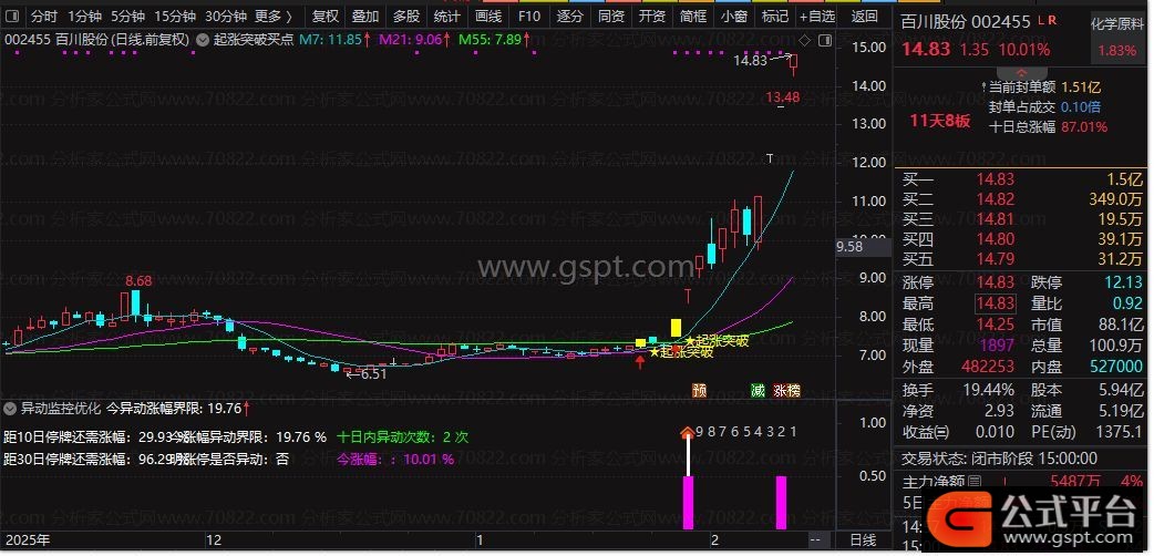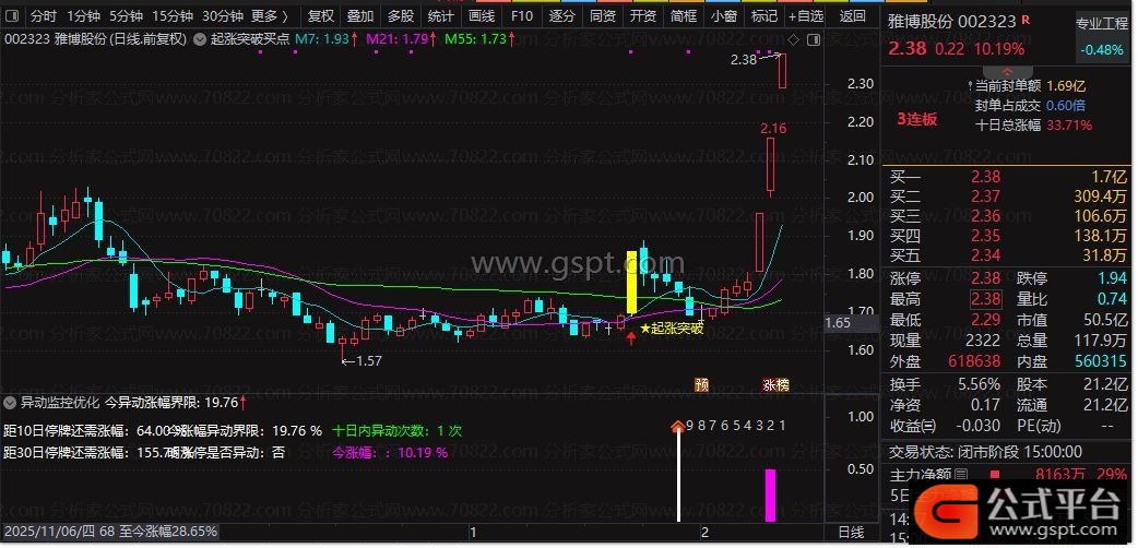 明涨停是否异动:=IF(B6>19.9,1,0);