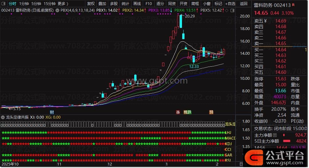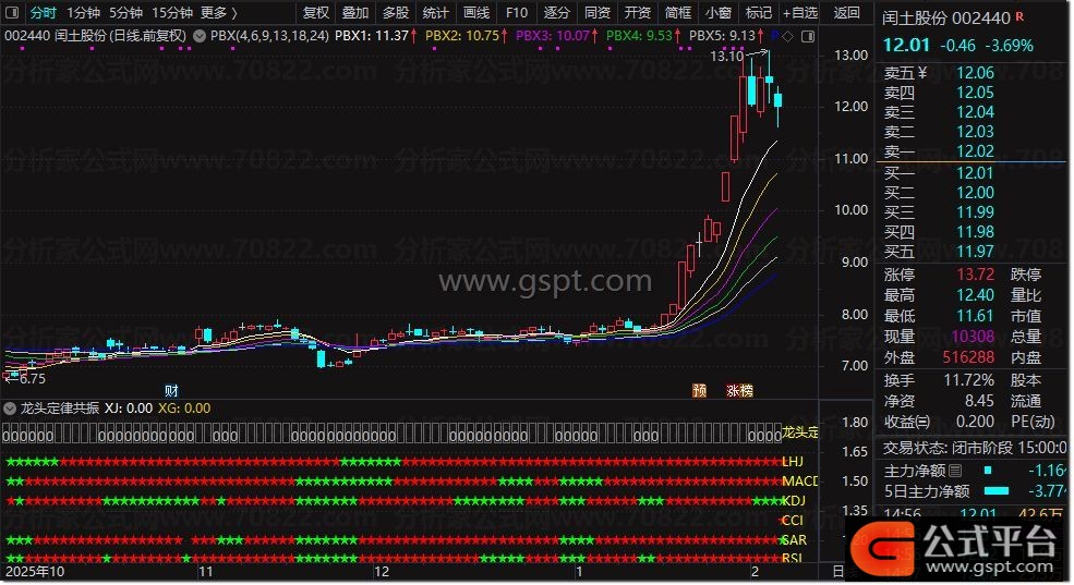 2. 共振筛选:重点关注副图上方“龙头定律”旁的数字,数字代表多头共振指标数量;