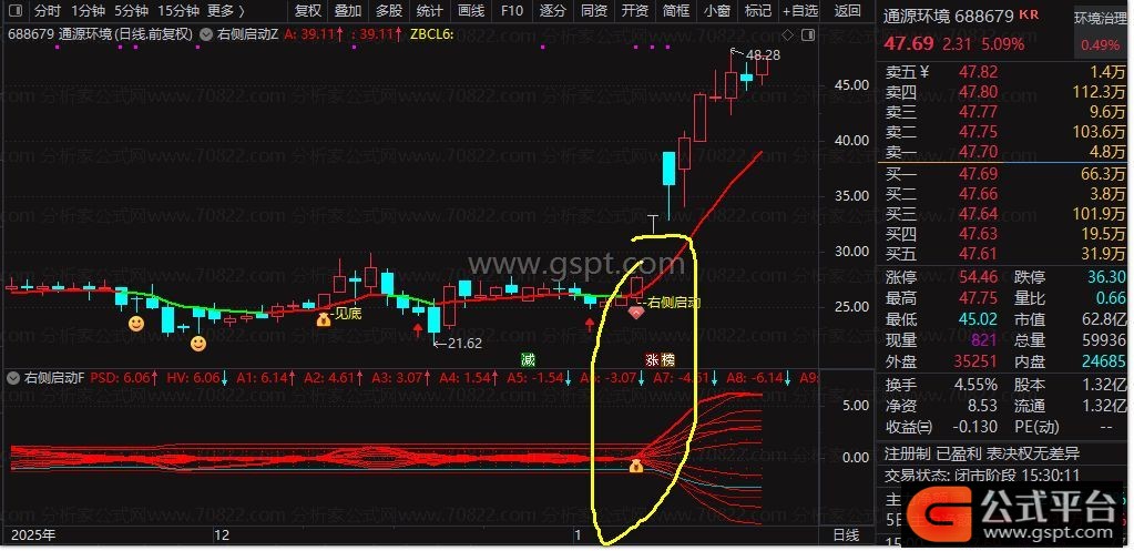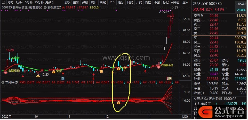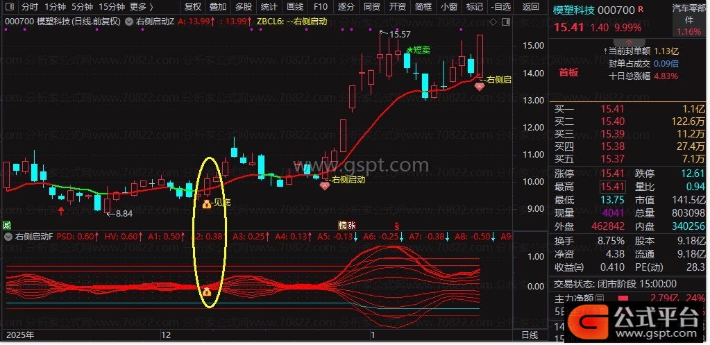 1. 主图公式:加载后,K线图中出现“右侧启动”黄色标注+图标时,代表多指标共振形成上涨启动信号;“★短卖”提示短期冲高止盈,“--见底”提示阶段性底部;