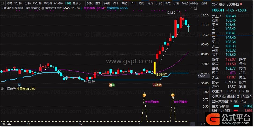 牛回趋势包含副图指标与选股公式,核心通过量价形态、4日EMA趋势、9日震荡指标多维度共振,筛选非ST、非688科创、上市超60日的合规个股,精准识别趋势反转的牛股启动信号;副图与选股源码逻辑一致,仅副图新增点状线、图标及文字标注,更直观展示信号位置。