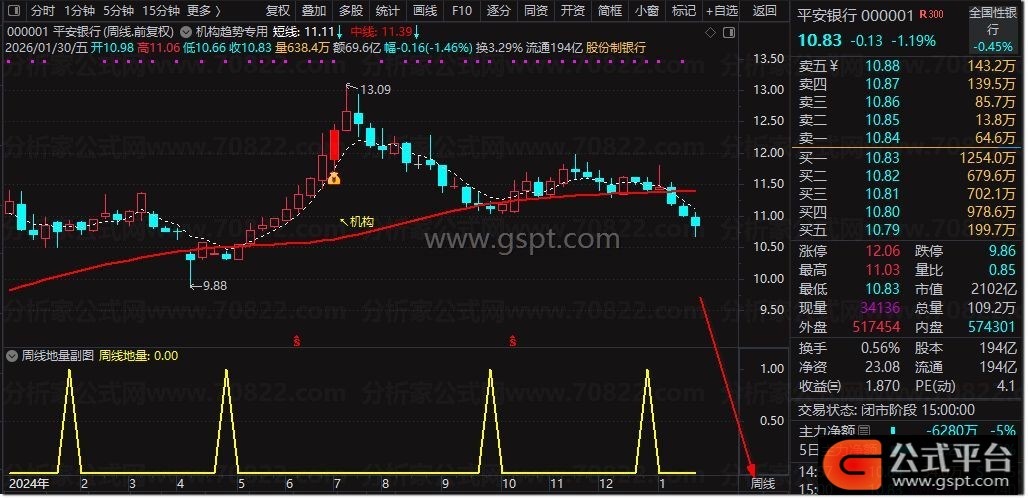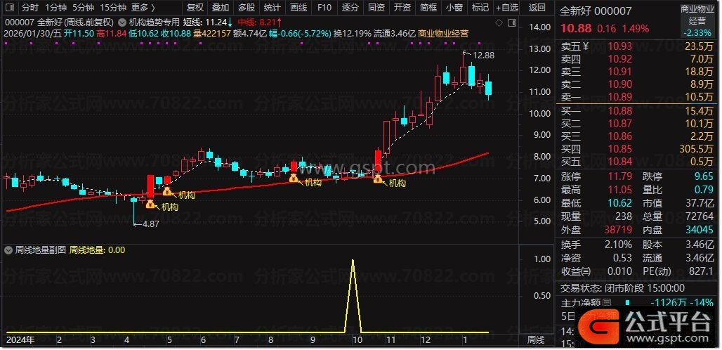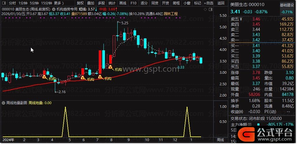 2. 该指标通过将均线调整到周线级别,确保在周线周期走完后信号才固定不动,提供稳定的中长期交易参考,帮助投资者应用周线地量选股方法进行决策。