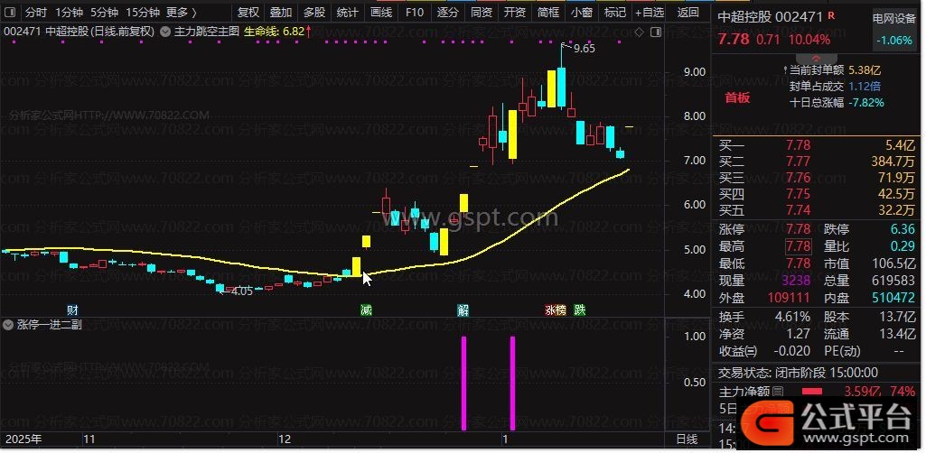 涨停一进二:=(gspt22 AND (gspt21>=1 AND gspt21<=5)) AND ((gspt20>10000 AND C>20) OR (gspt20>30000 AND C>10 AND C< 20) OR (gspt20>80000 AND C< 10));