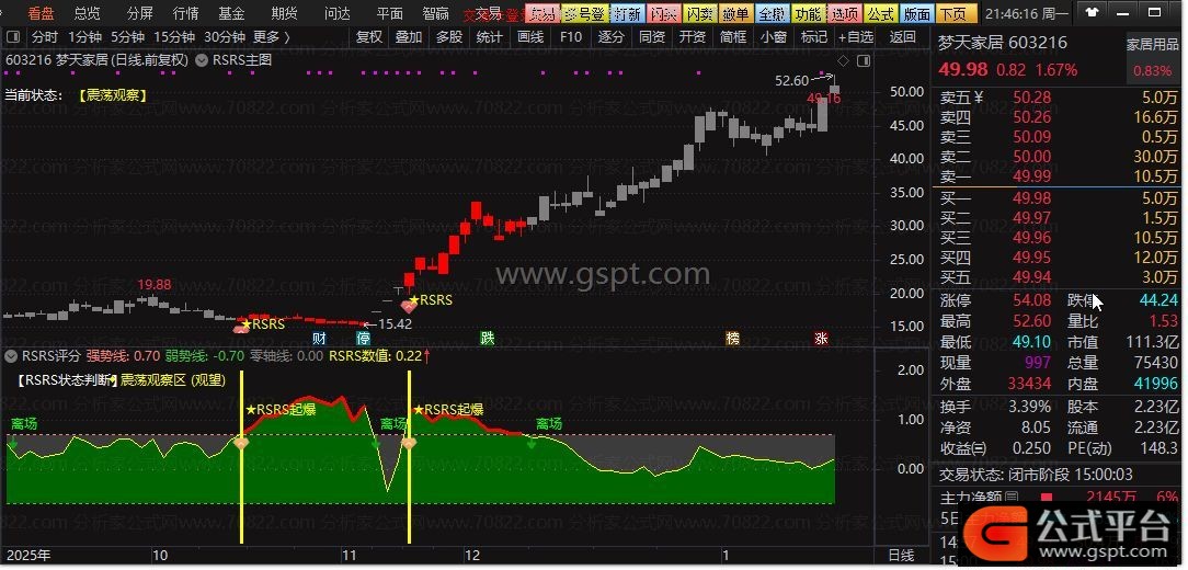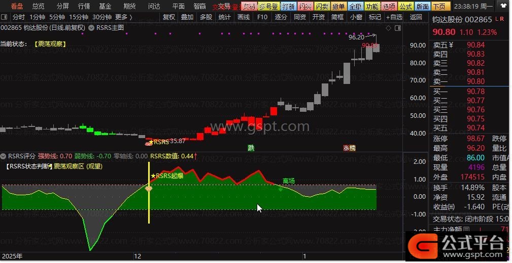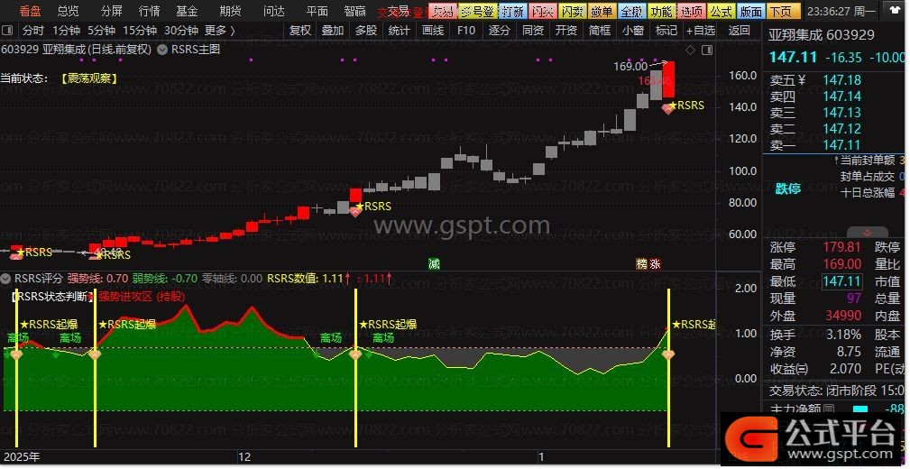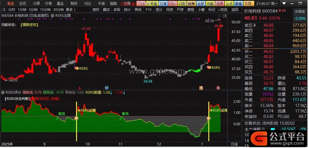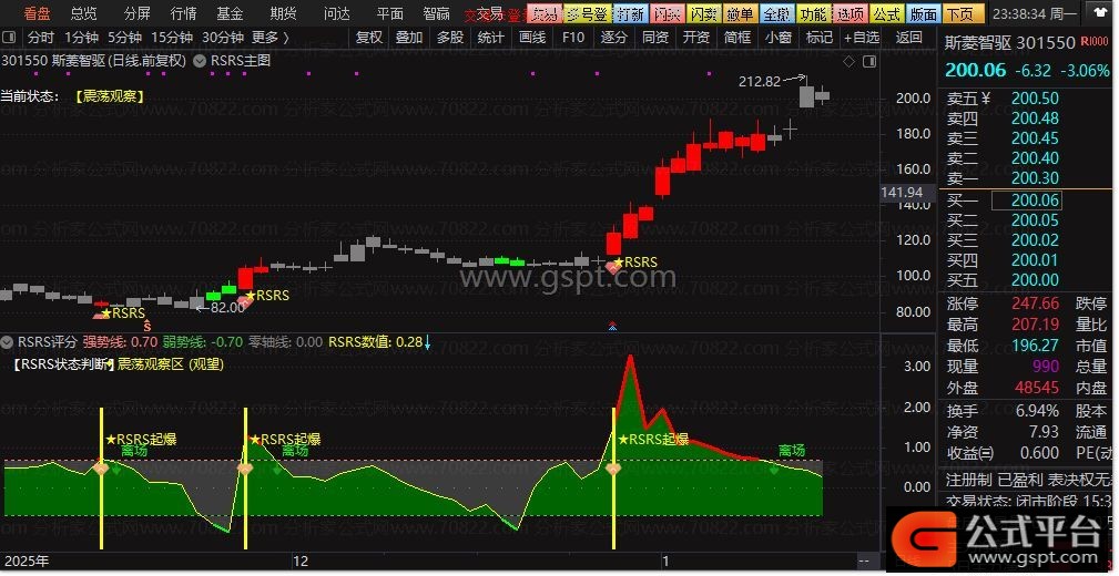 当副图RSRS数值跌破0.7(脱离强势区间),或进一步下穿-0.7(确认进入熊市),即为离场信号。