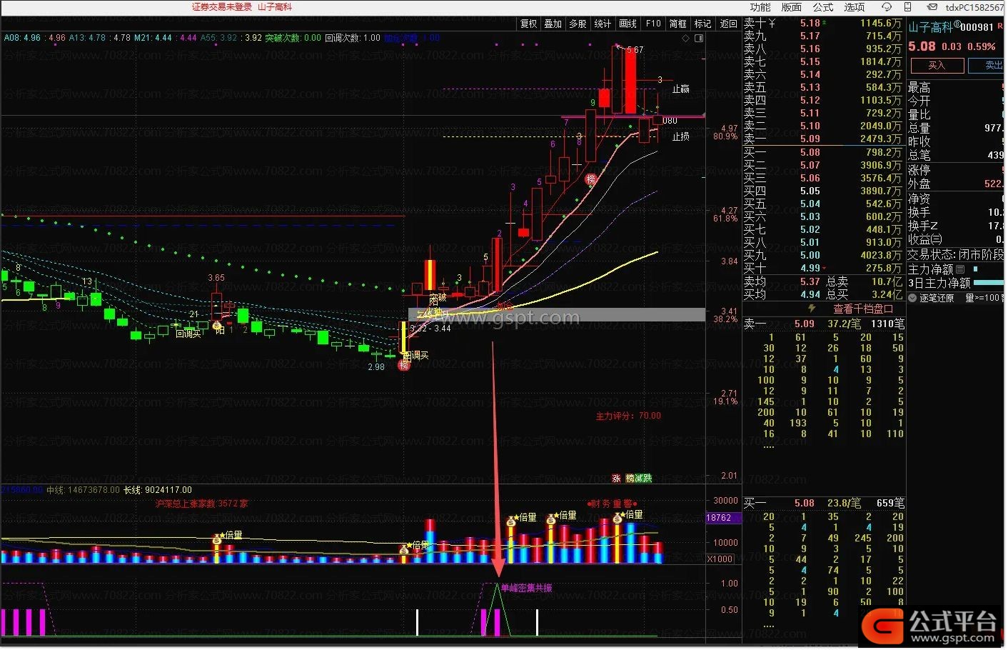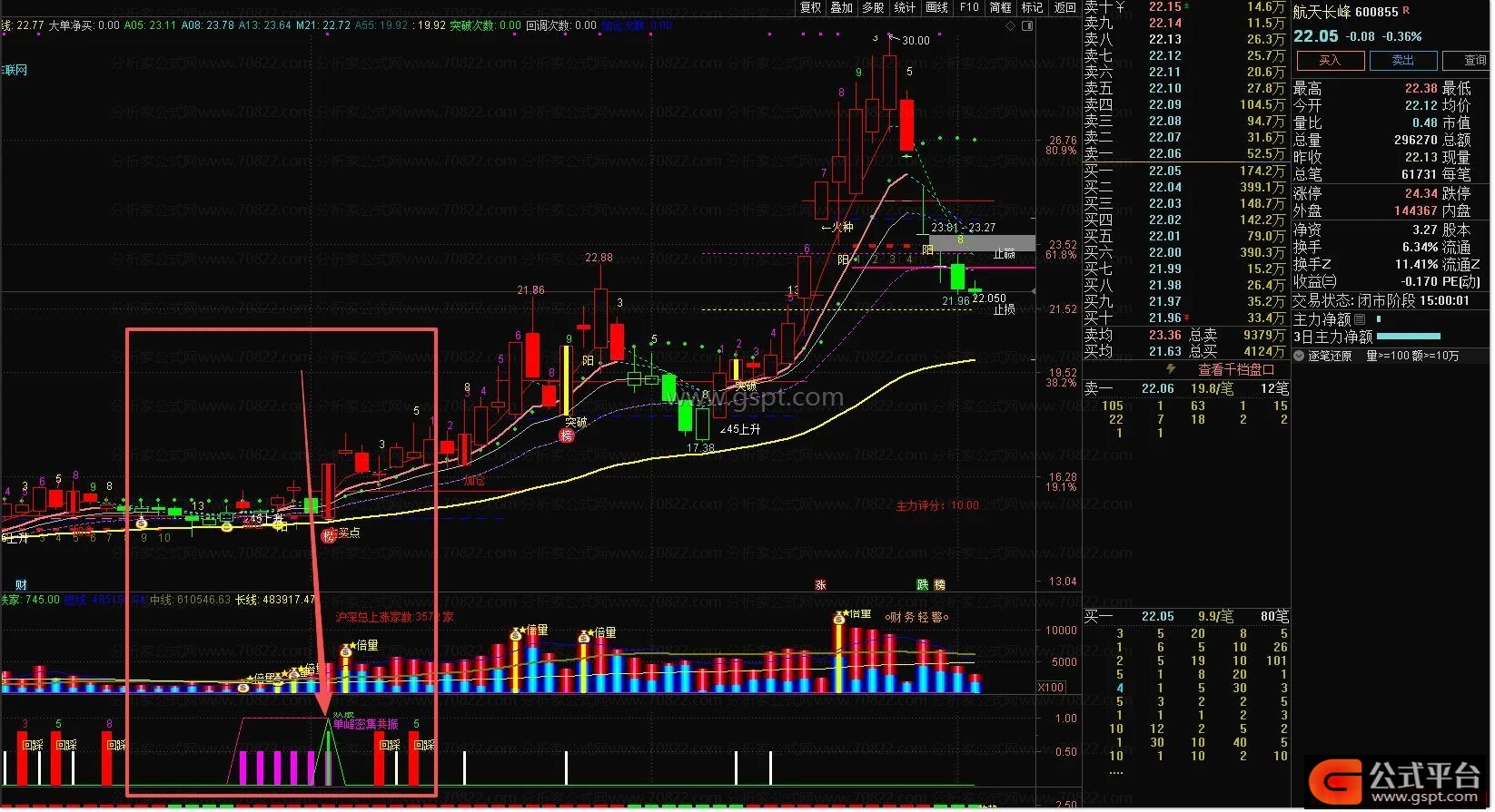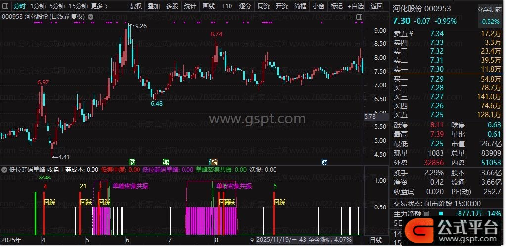 1. 信号识别:副图中粉色柱线为“低位筹码单峰”信号,粉色“单峰密集共振”提示筹码+突破双重确认;红色柱线+数字(3/5/8等)为涨停回踩信号,绿色“妖股”提示游资驱动的强势突破。