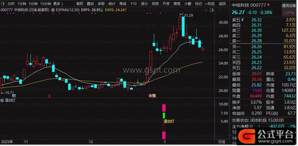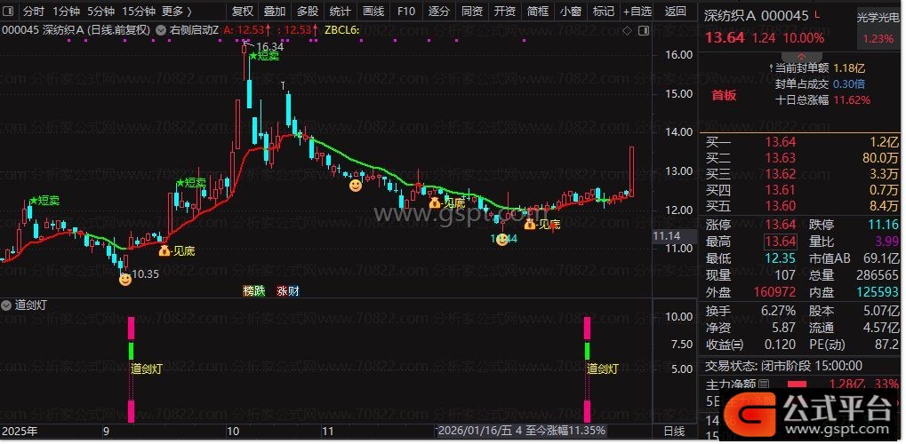 2. 副图出现“道剑灯”文字+紫红色灯型为核心信号,适用于短线参考;
