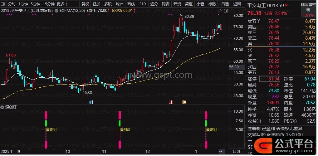 指标核心逻辑是捕捉MACD差值异动缩量、短期股价由跌转涨且突破关键均线的共振信号,当满足条件时,副图会显示紫红色柱状灯型,并标注黄色“道剑灯”文字,直观提示交易机会。