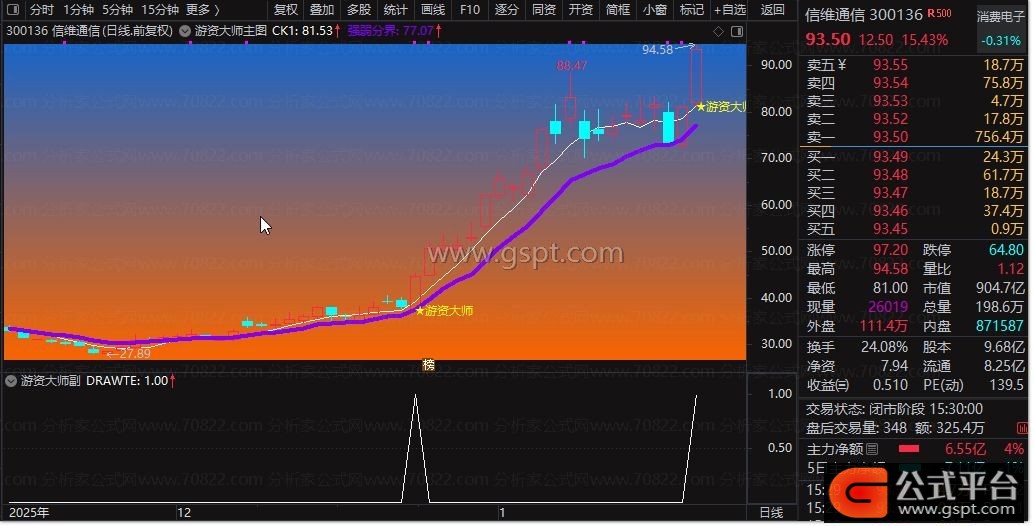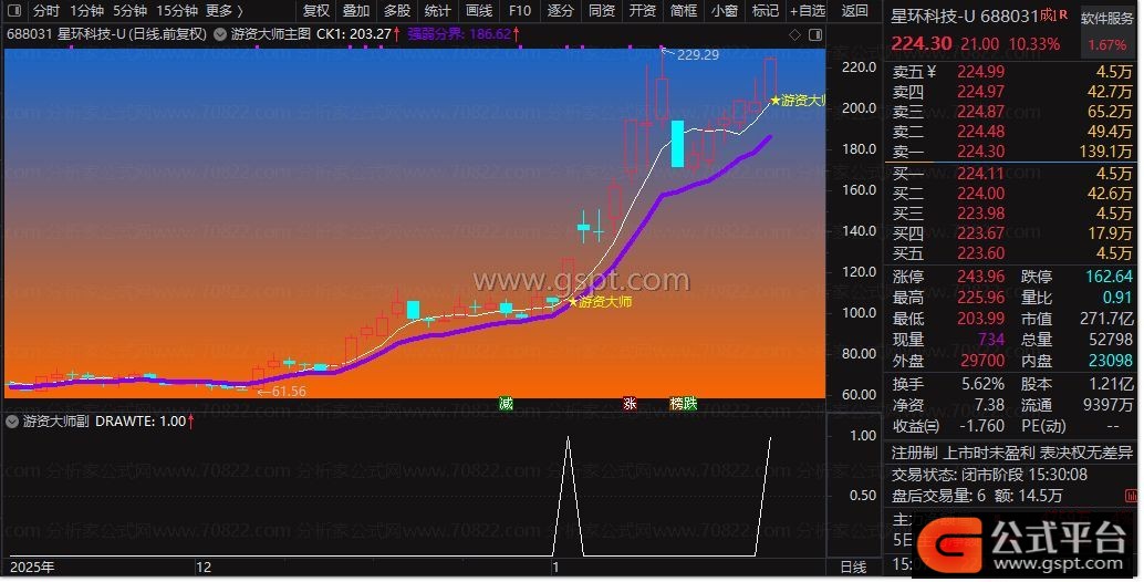 2. 当强弱指标(B02HA/B02JA)超65、均线多头排列、股价突破压力且涨幅超6.5%时,K线会标注黄色“★游资大师”信号,同时超强势K线以青色高亮显示,提示游资介入拉升;