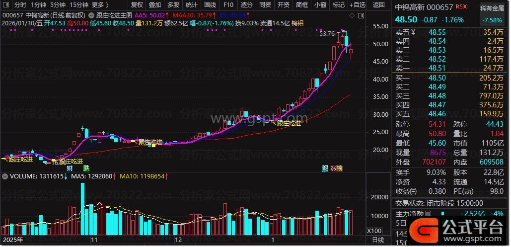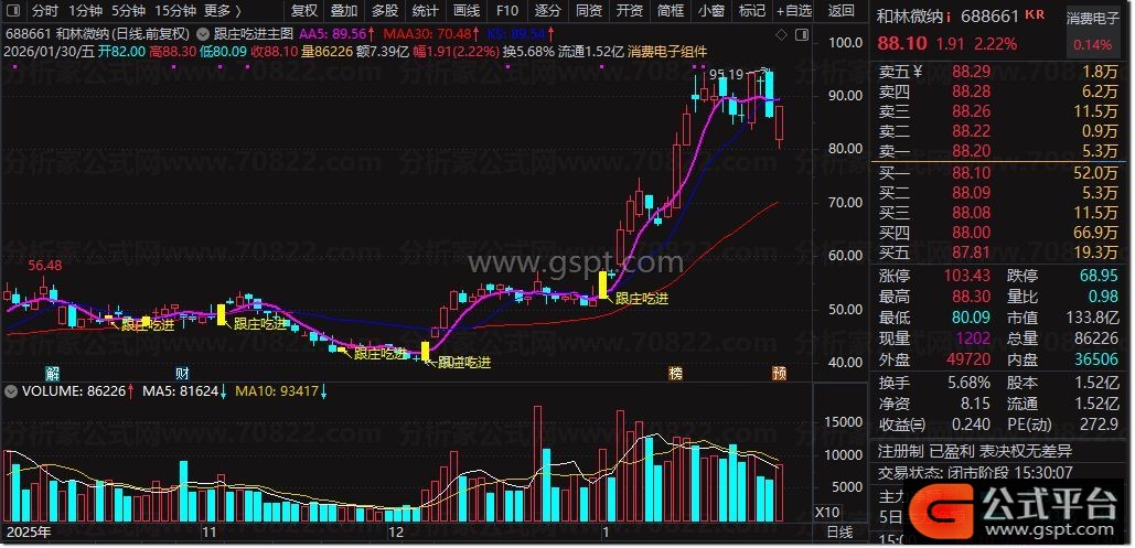 核心融合均线系统与震荡指标,5日(粉紫粗线)、10日、30日(红色)均线明确趋势,蓝色线为10/30日均线多头排列支撑位;内嵌RSI衍生指标+6日双EMA震荡指标,通过量价异动识别主力吸筹,出现黄色“↖跟庄吃进”文字+黄色K线时,为核心低吸信号。