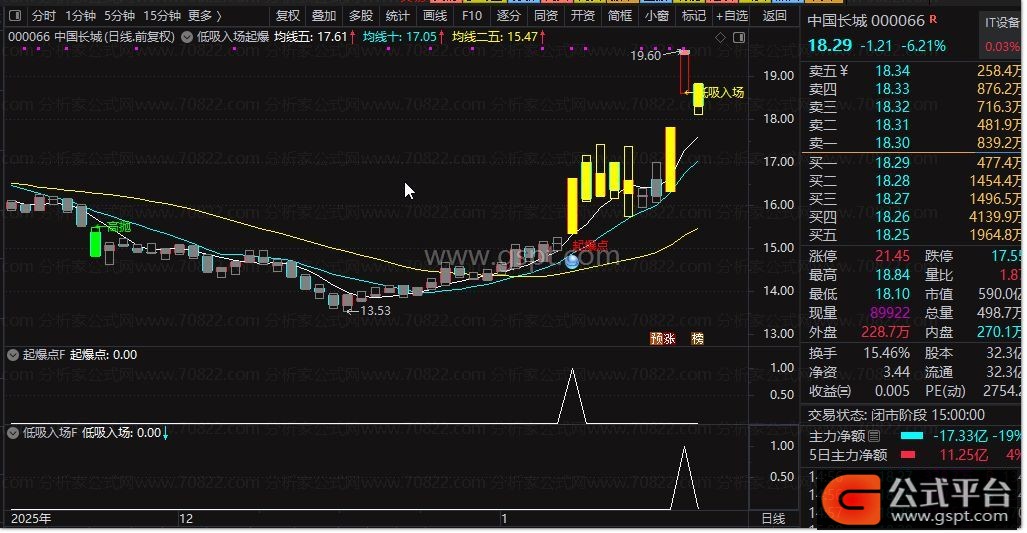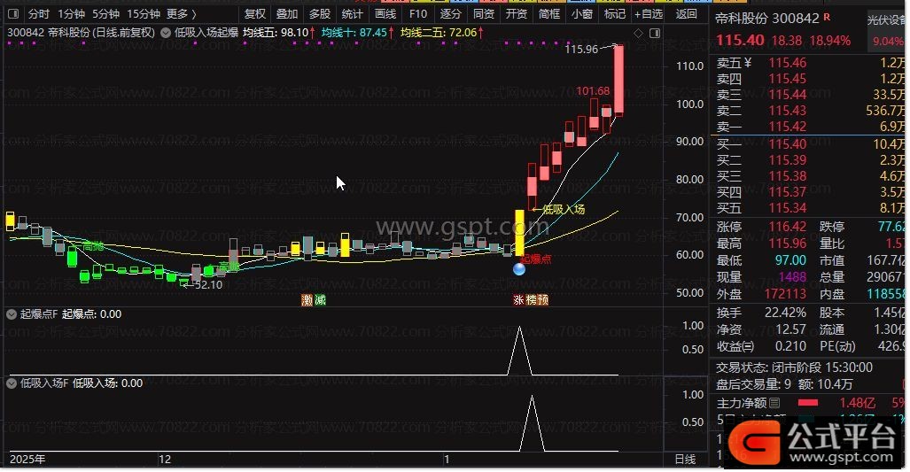主图公式:显示5/10/25日均线,将股价划分为0-4共5个等级并以不同颜色K线呈现,自动标注“高抛”“低吸入场”“主力拉升”文字提示;当满足量能放大、价格突破7%目标位等条件时,会标注“起爆点”并配图标,直观展示关键信号。