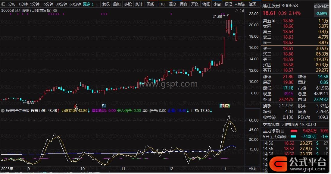 买入信号:CROSS(超短力度,力度均线) AND 超短力度>0 AND 量能配合;
