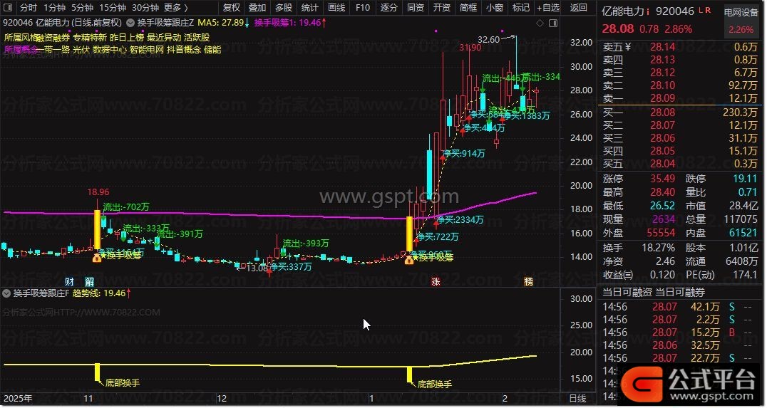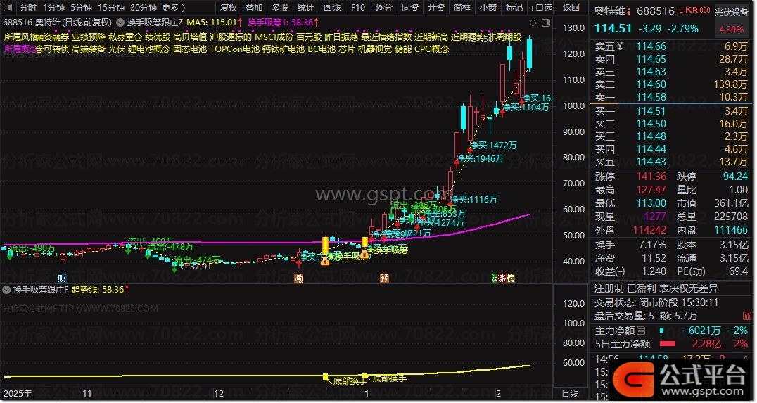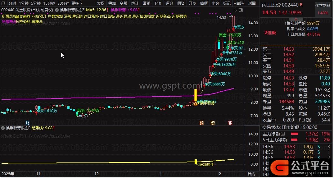 主图通过成交量与价格结构精细计算“净流入”,当净买超300万且涨幅≥4%时发出醒目标记,并叠加独创的“换手吸筹线”,一旦股价放量突破该线并涨停,即视为主力启动信号。