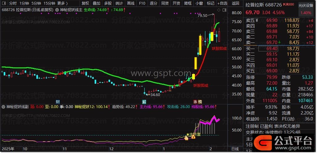 生命线红色为多头趋势、绿色为空头趋势,股价站上生命线是基础做多信号;出现黄色实体K线+“妖股即成”,代表股价低开站上生命线且单日涨幅超7%,妖股启动信号初现;出现“起飞”字样,是个股突破压力线、叠加涨停/强势突破的主升浪加速信号,可重点关注。高亮彩色K线为涨停/高涨幅标的,是强势股特征。